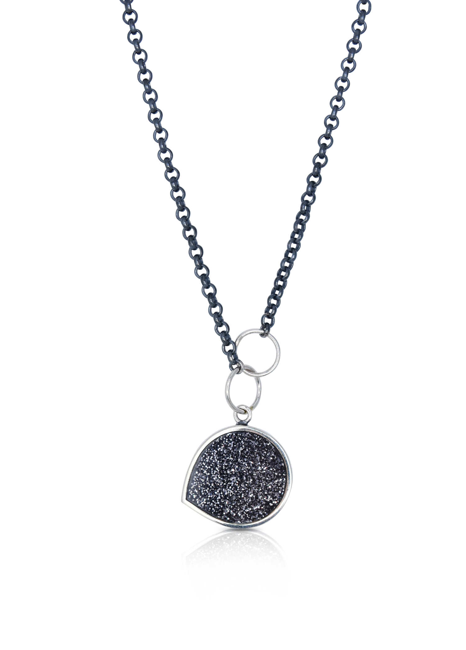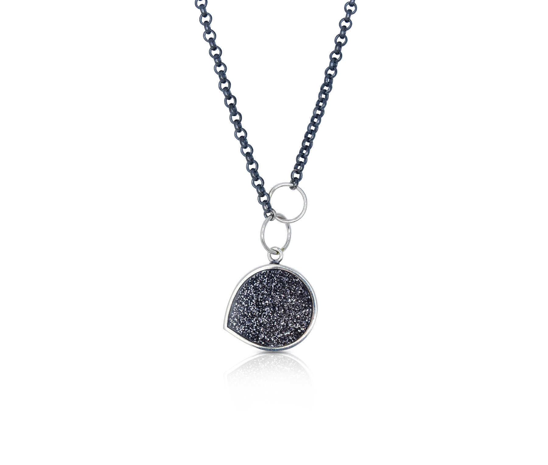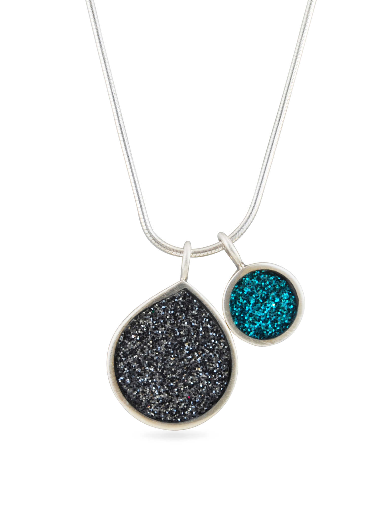 Sterling silver, charcoal and peacock glitter, resin pendant [$420]