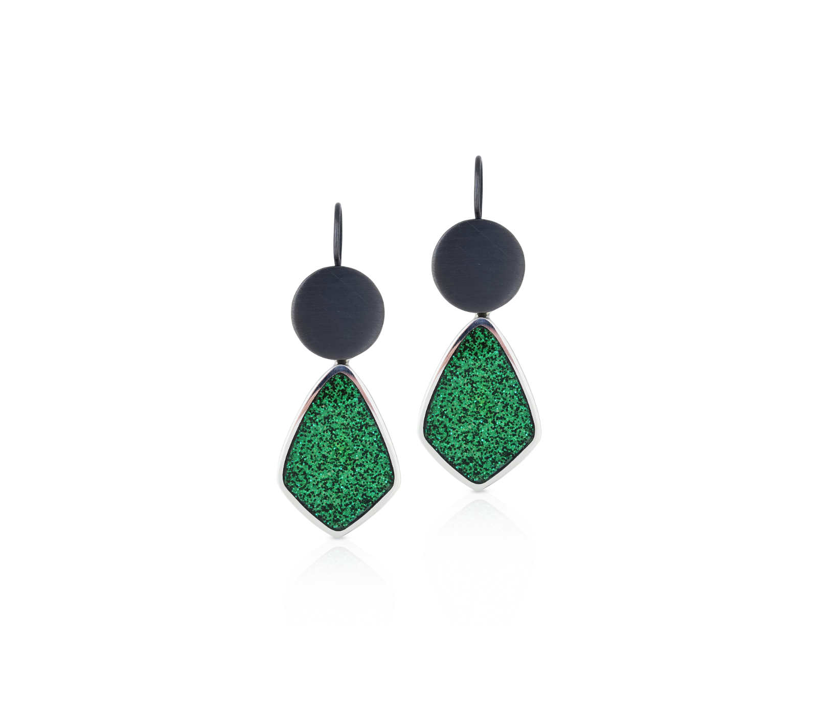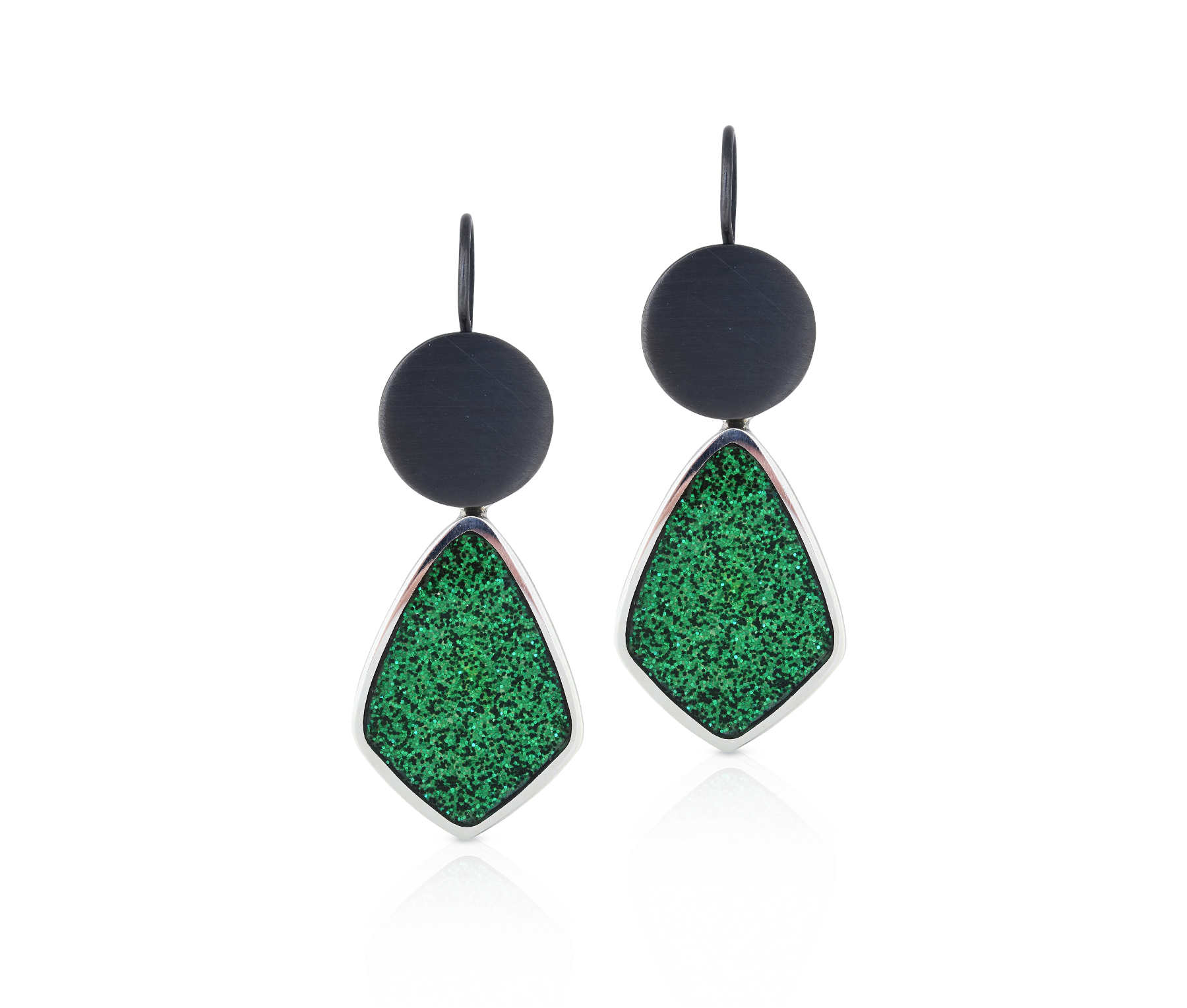 Sterling silver oxidised, evergreen glitter, resin earrings [17 x 48mm] [$425]