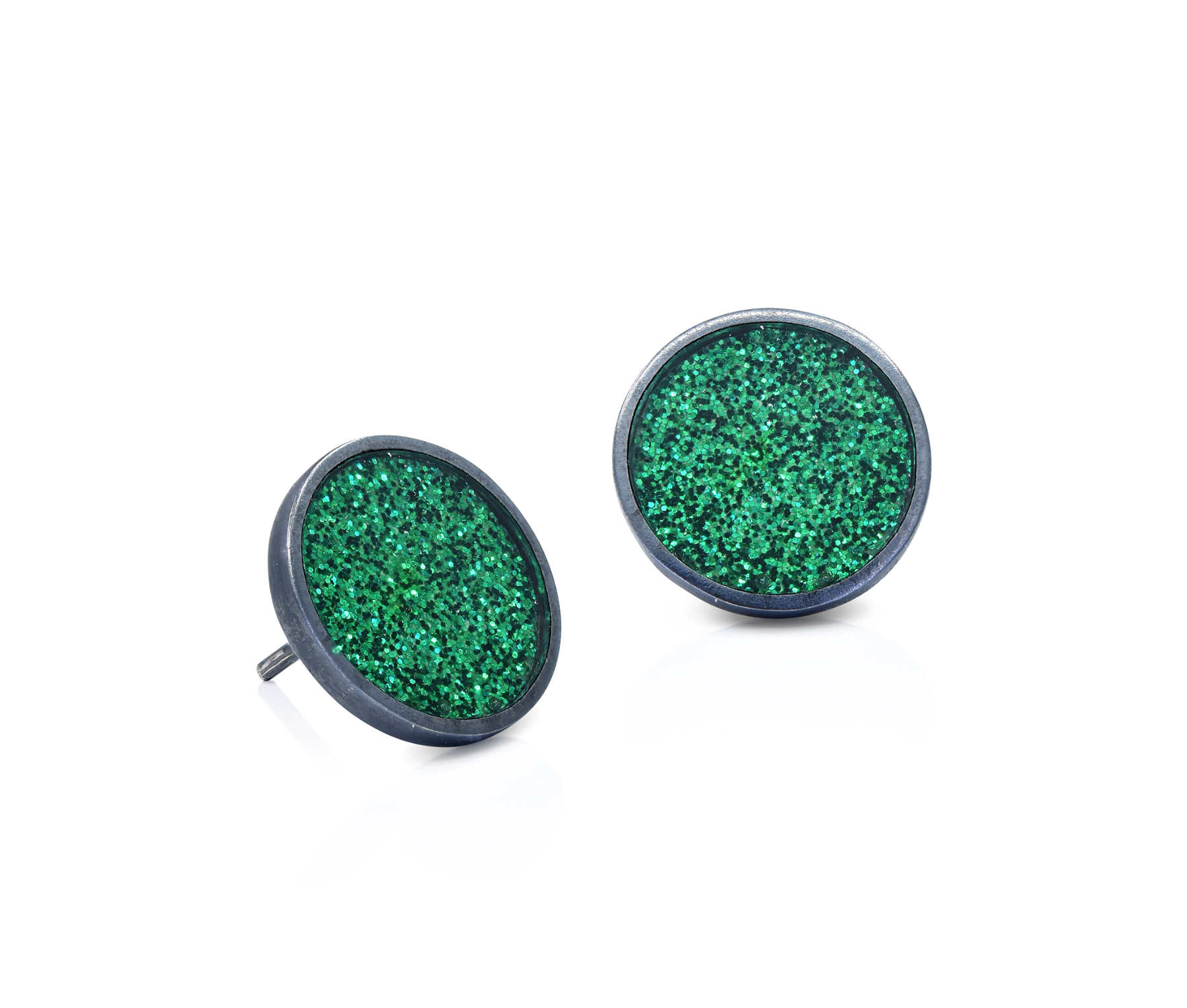 Sterling silver oxidised, evergreen glitter, resin earrings [15mm diam.] [$295]