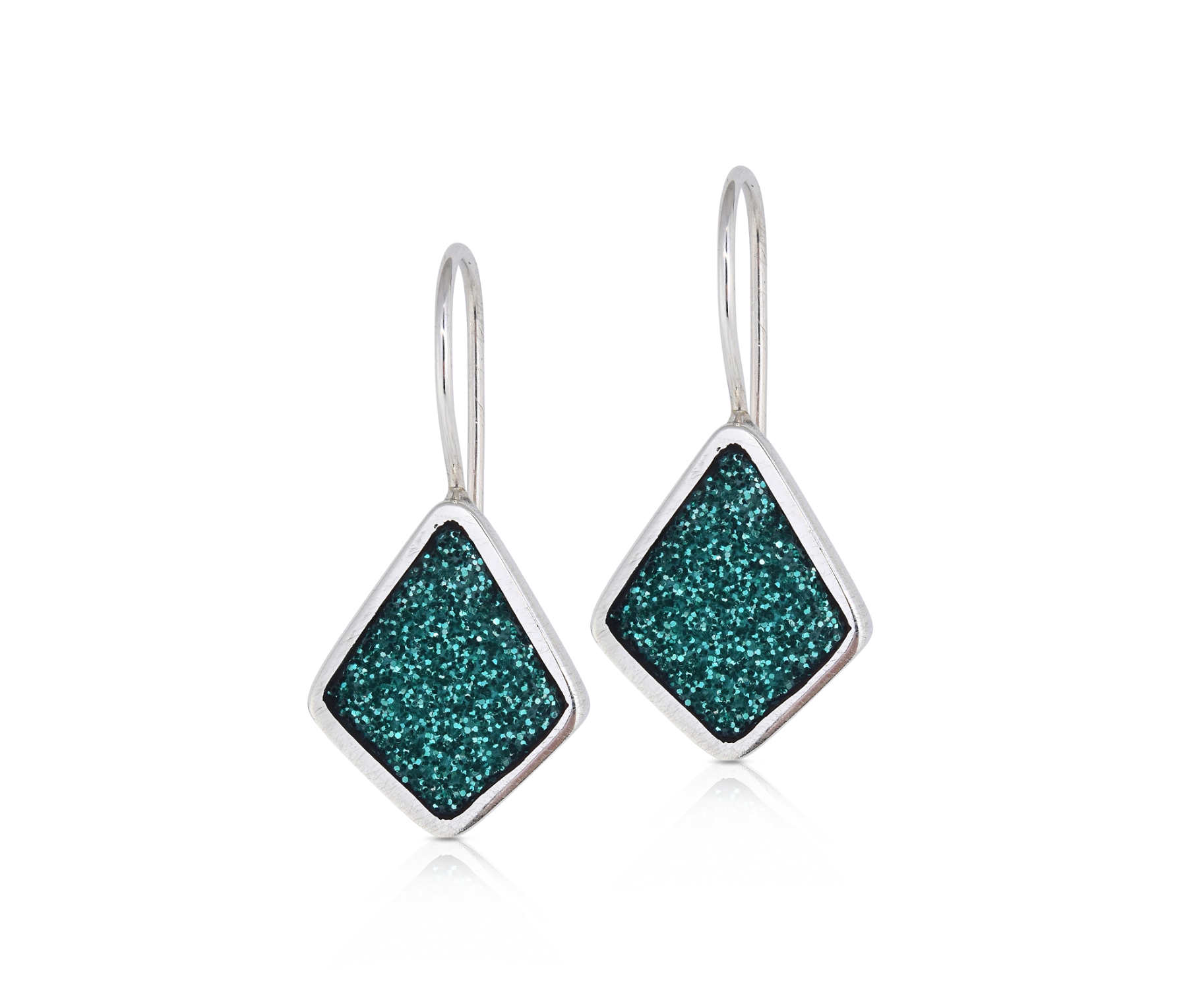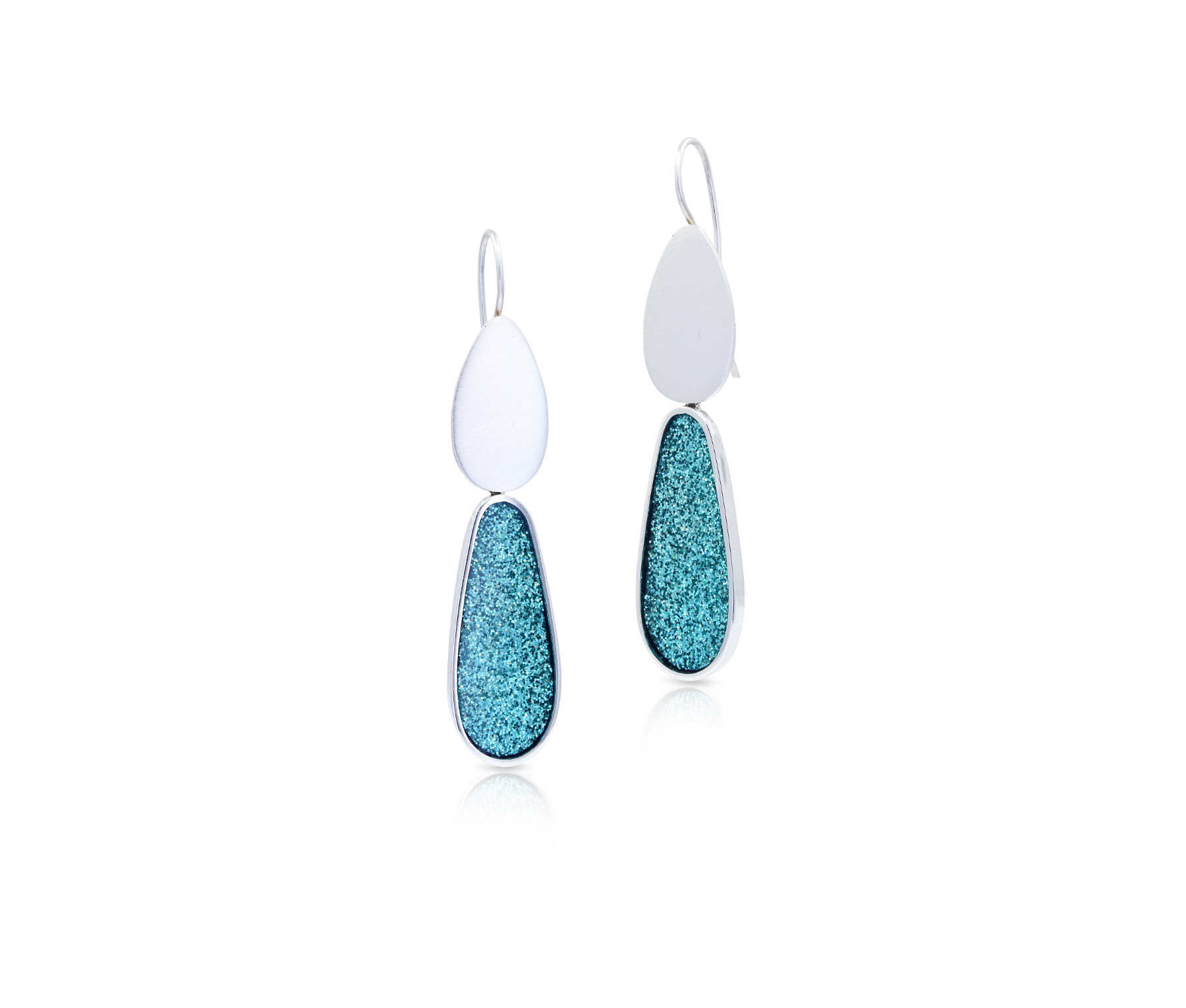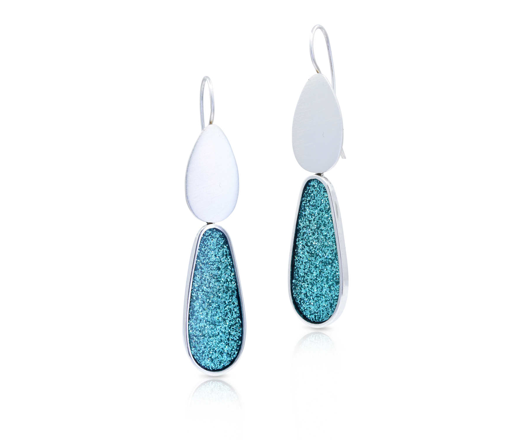 Sterling silver oxidised, aqua glitter, resin earrings [12.8 x 59mm] [$425]