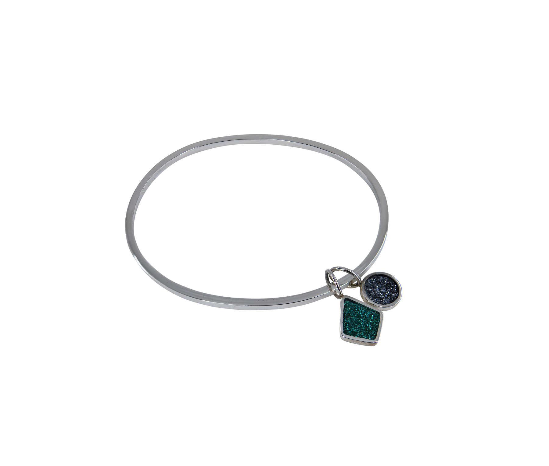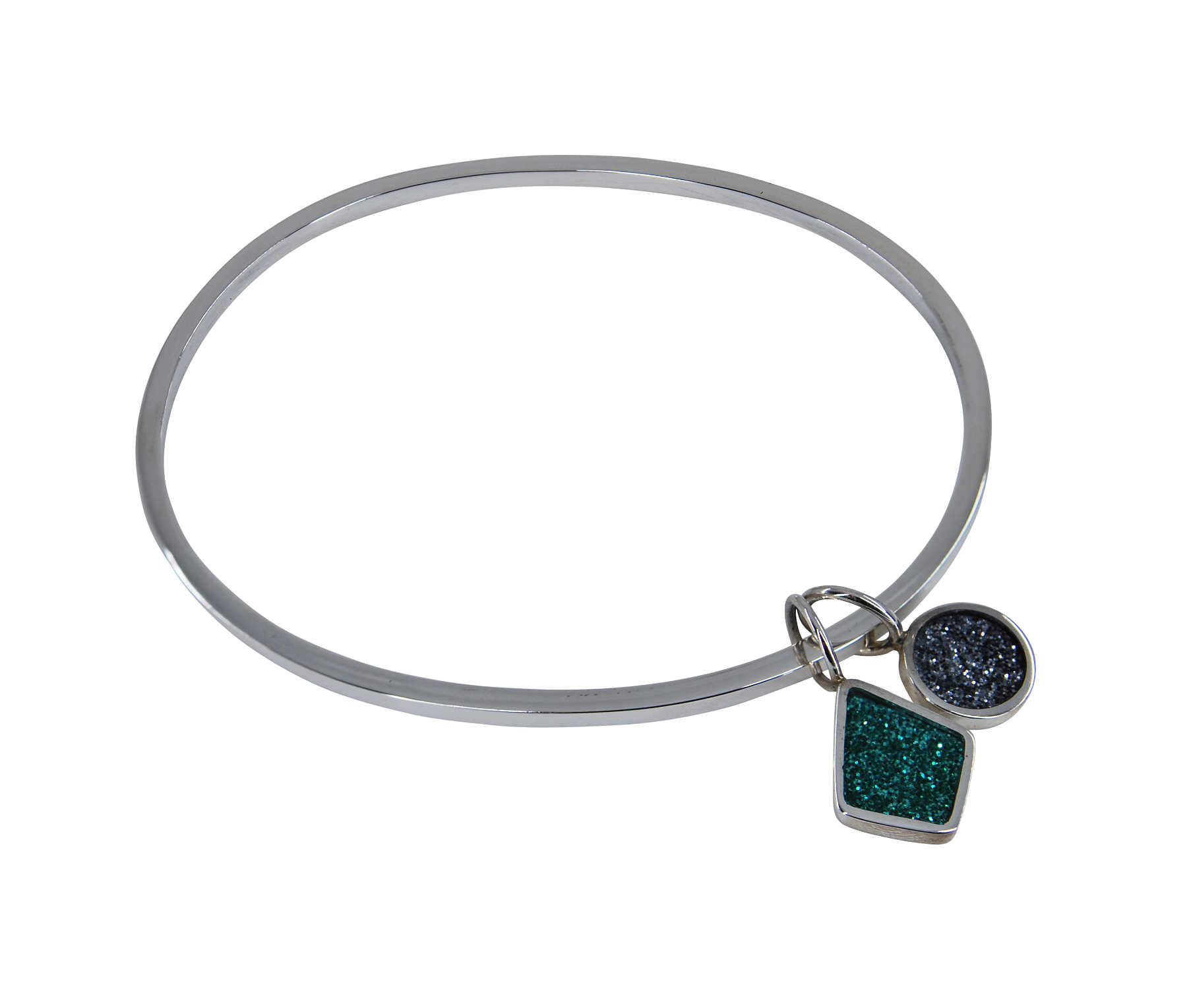 Sterling silver, charcoal and peacock glitter, resin bangle [2.5mm square wire, 60 x 70mm] [$425]