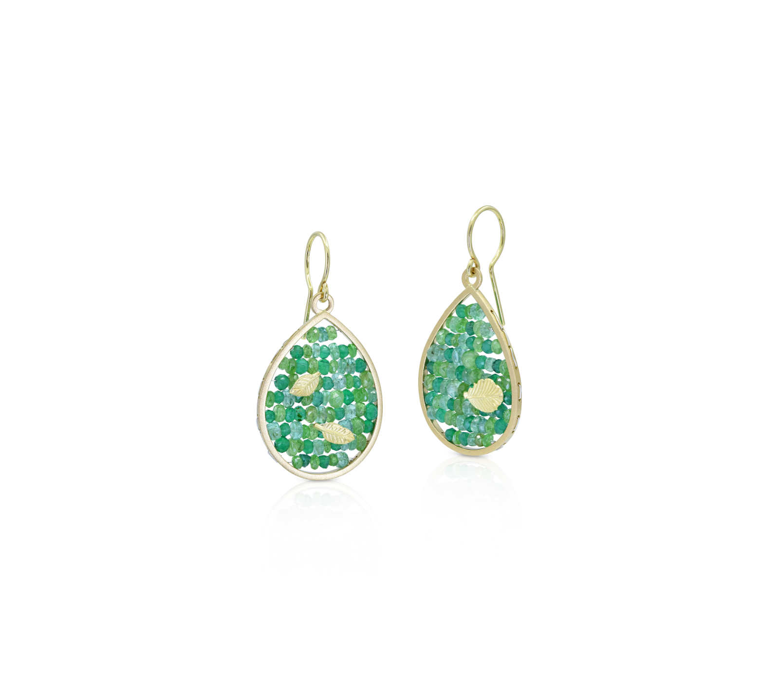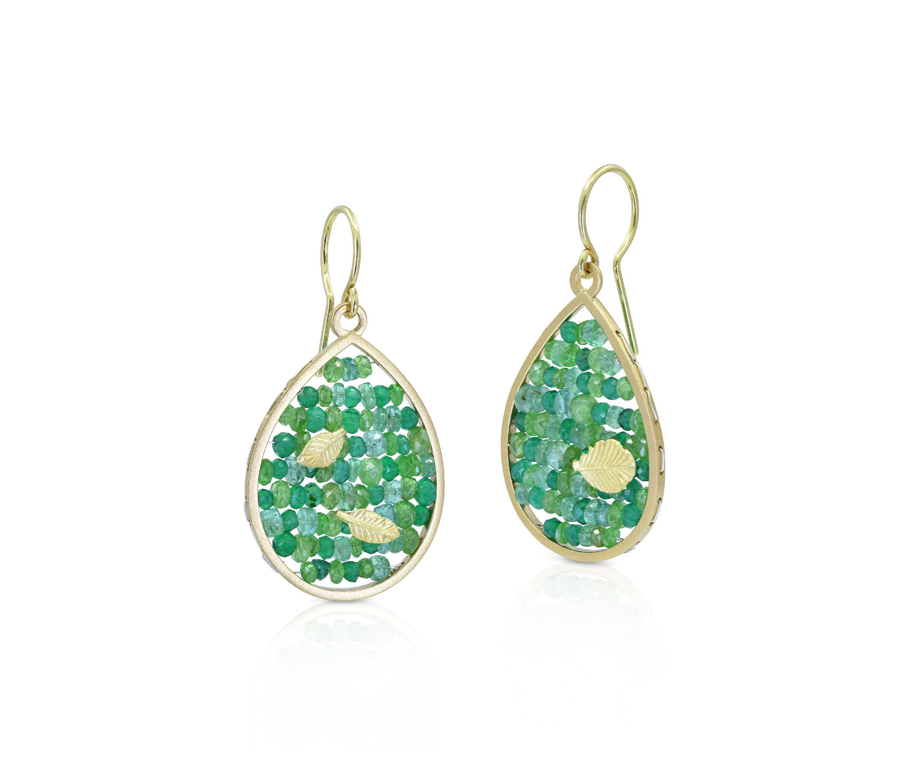 18ct yellow gold, emerald, tsavorite garnet, green onyx faceted beads, 3 gold leaf detail [Med 28 x 20mm] [$2,290]