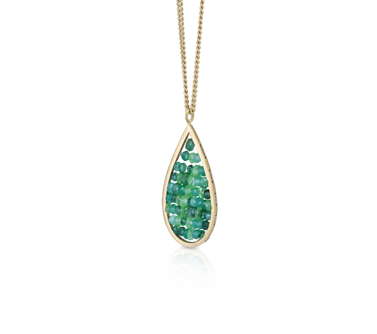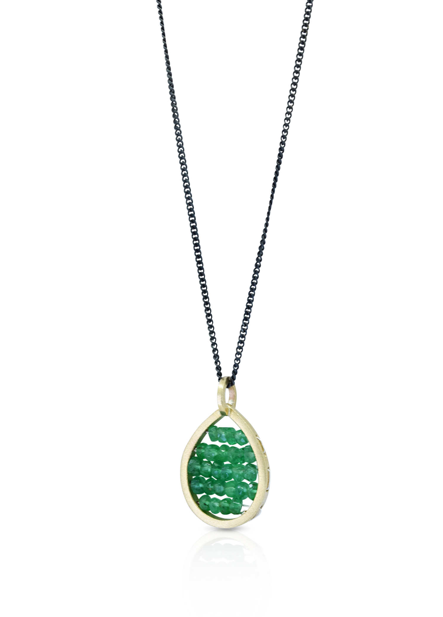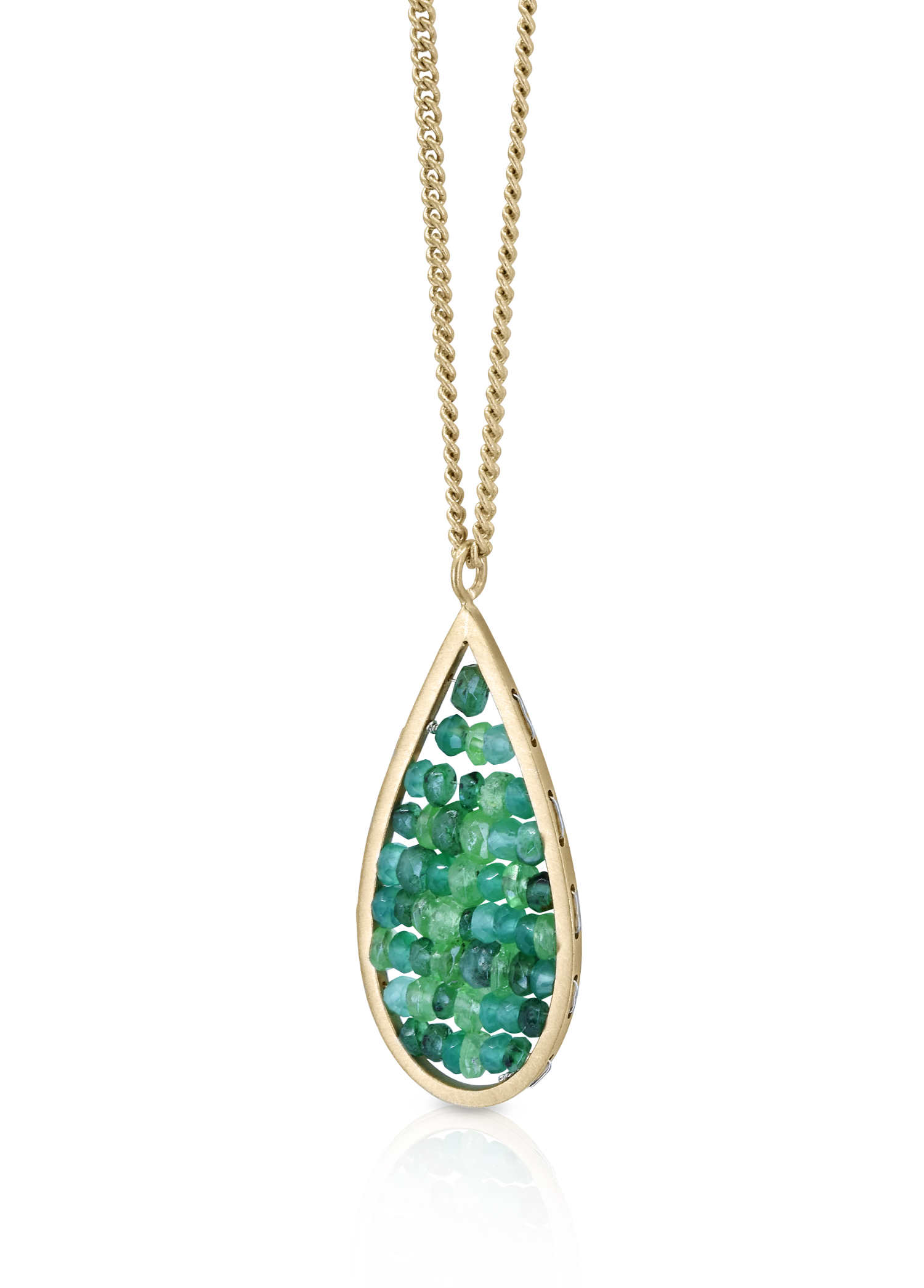 9ct yellow gold, emerald, tsavorite garnet, green onyx faceted beads, pear shape neckpiece [36.8 x 16.20mm, 47cm chain] [$1,290]