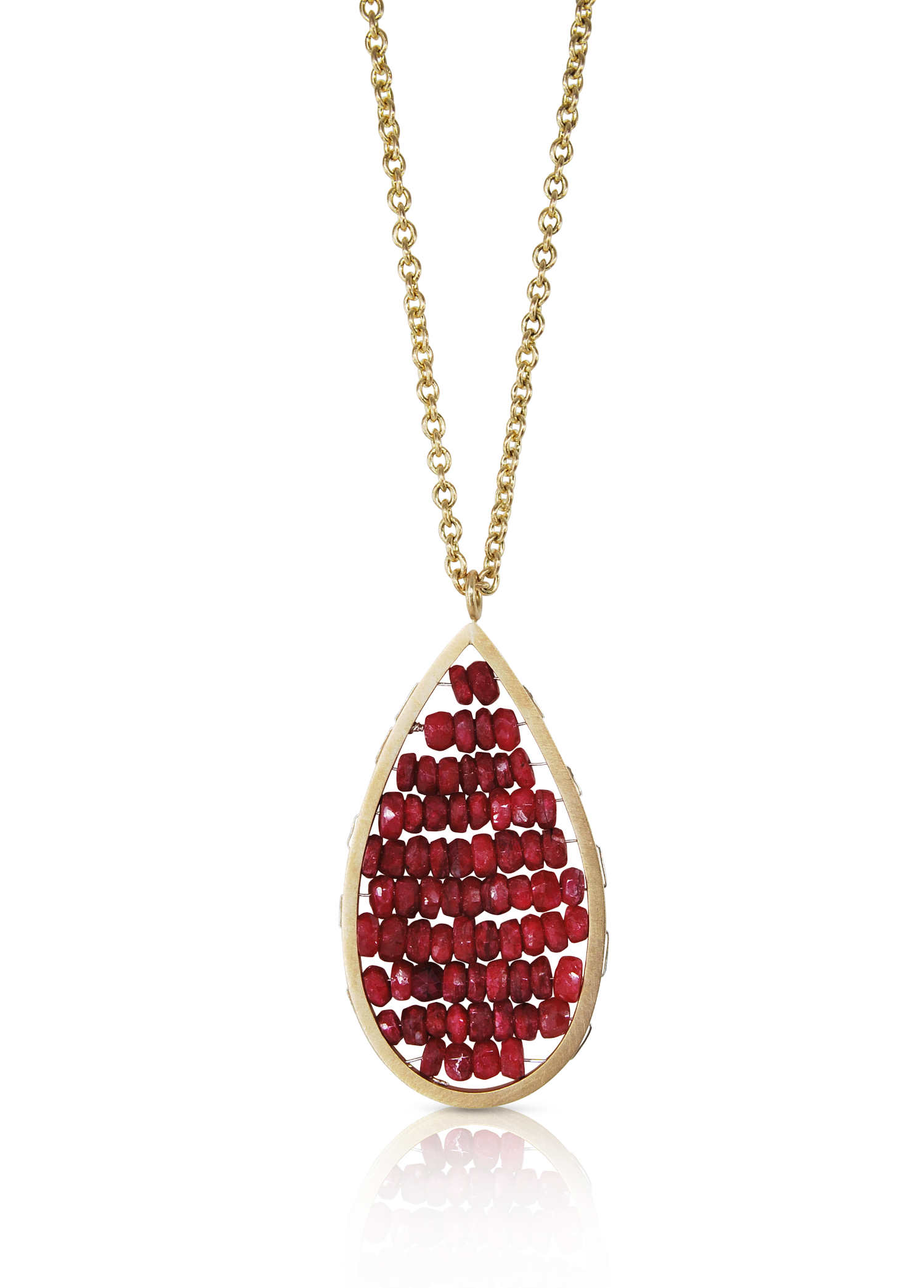 9ct yellow gold, ruby bead neckpiece [27 x 19mm, 45cm chain] [$1,255]