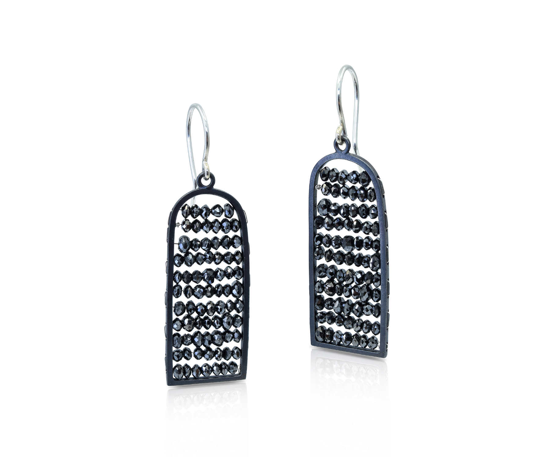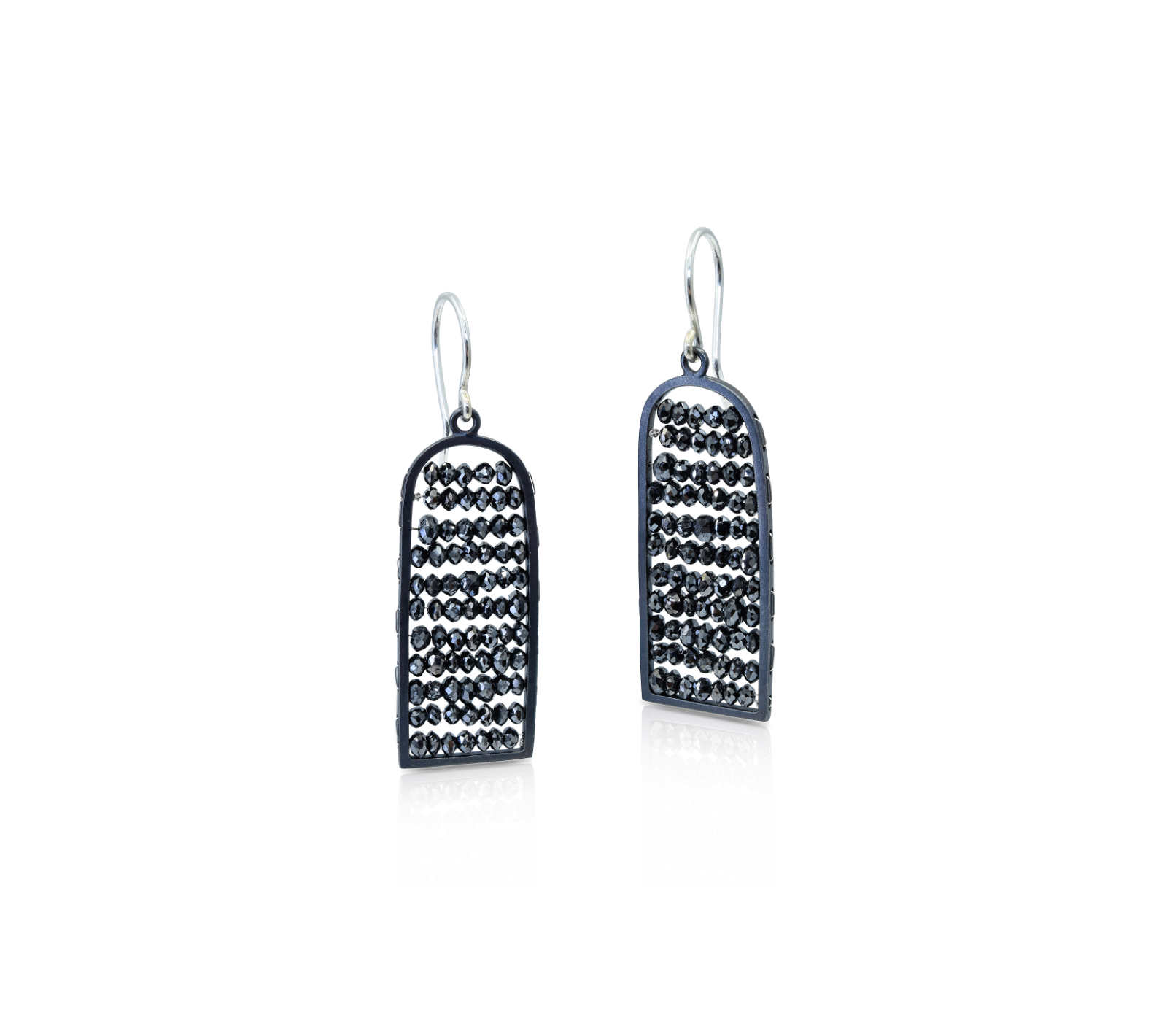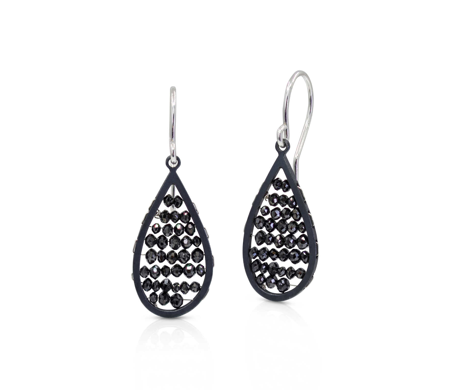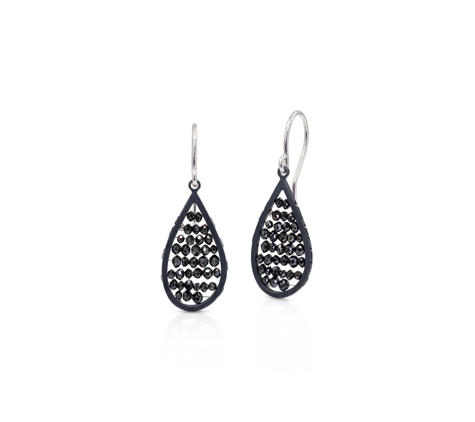 Oxidised sterling silver, faceted black diamond beads, pear shape hook earrings [36.13 x 12.26mm] [$1,065]