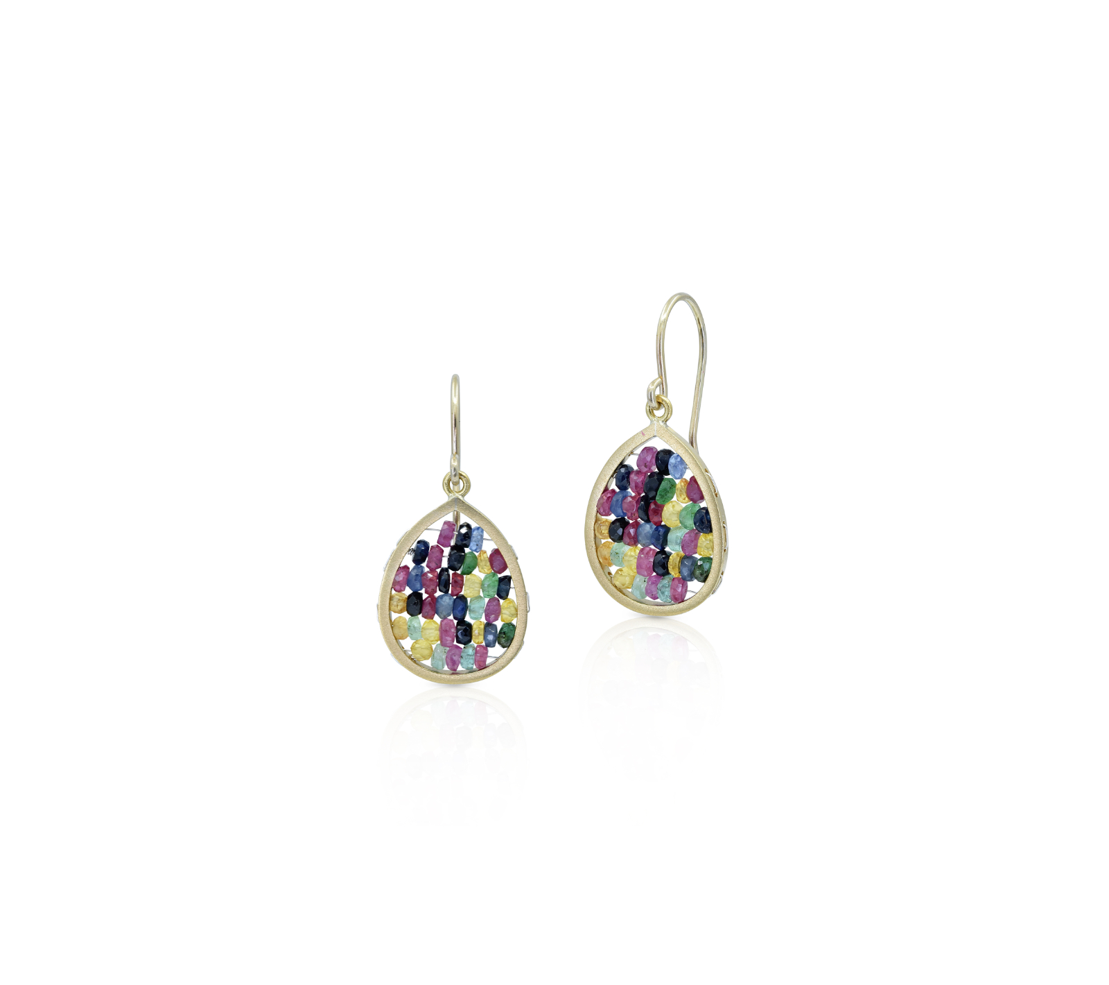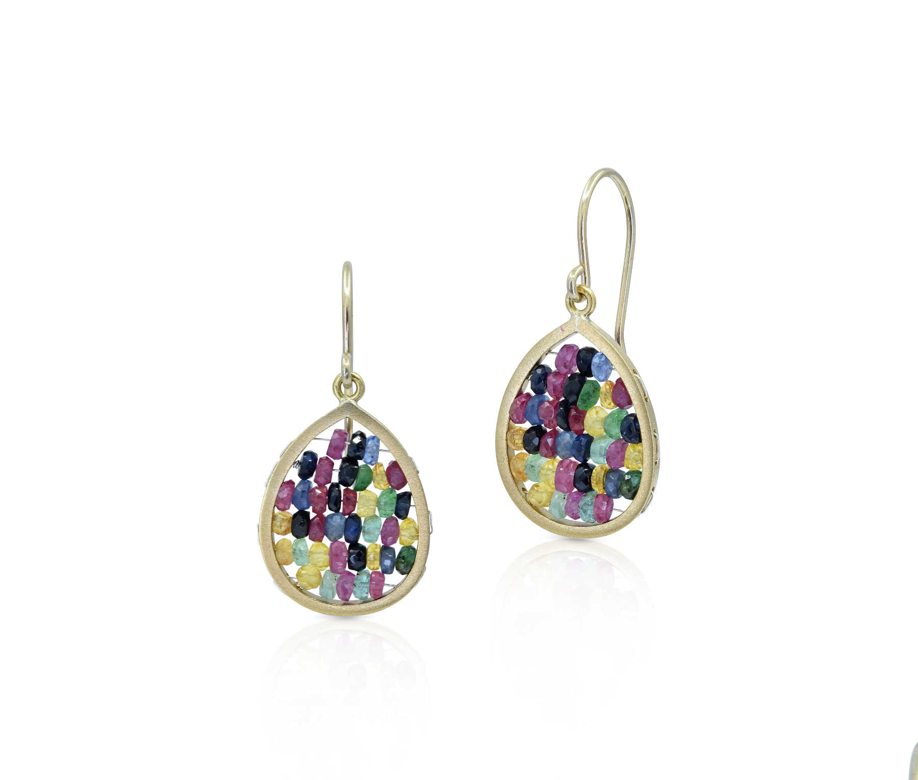 18ct yellow gold, mixed sapphires, emerald, ruby bead hook earrings [35.10 x 15.7mm] [$2,025]