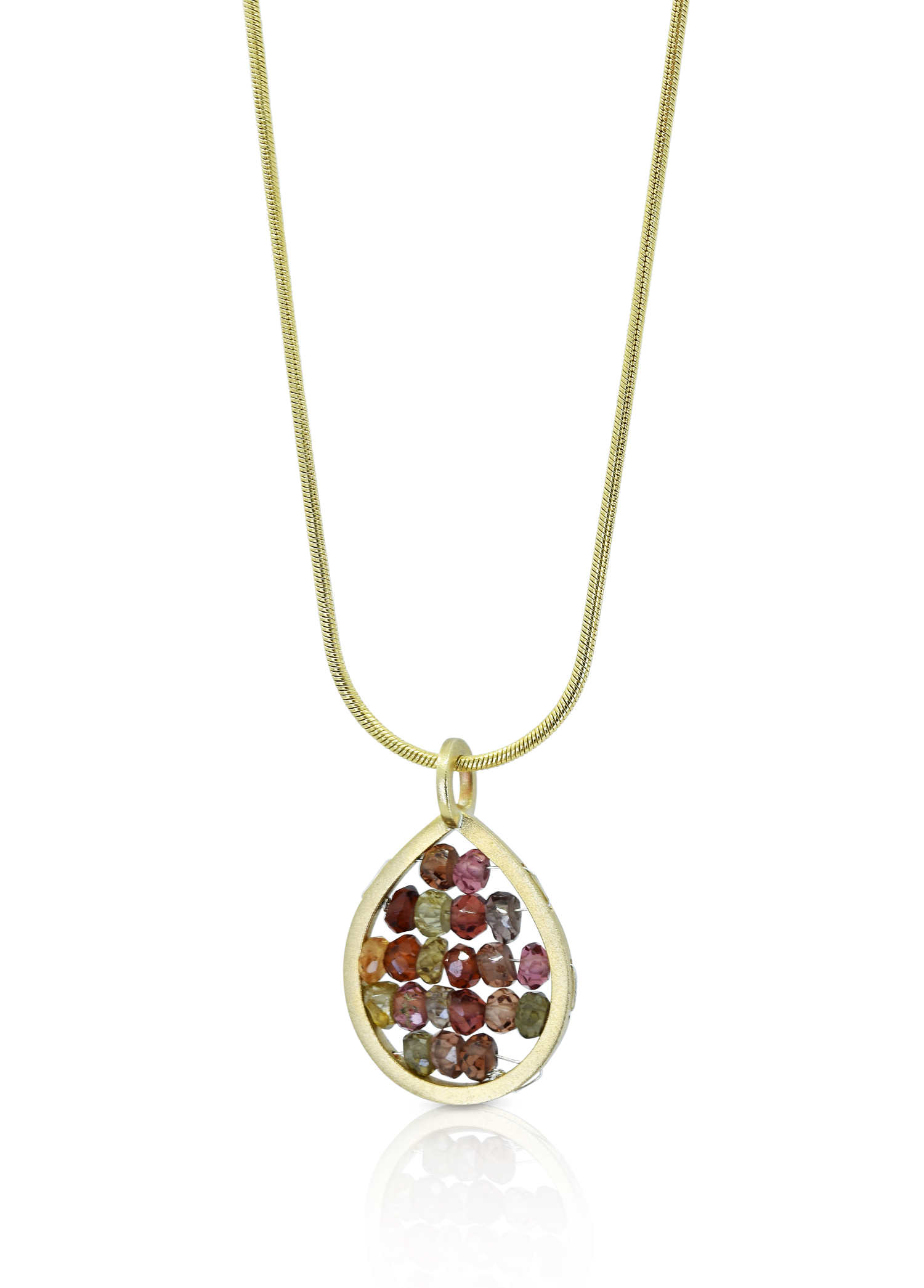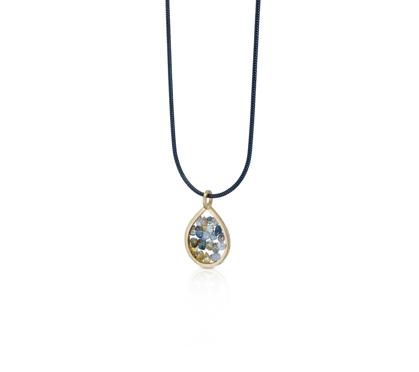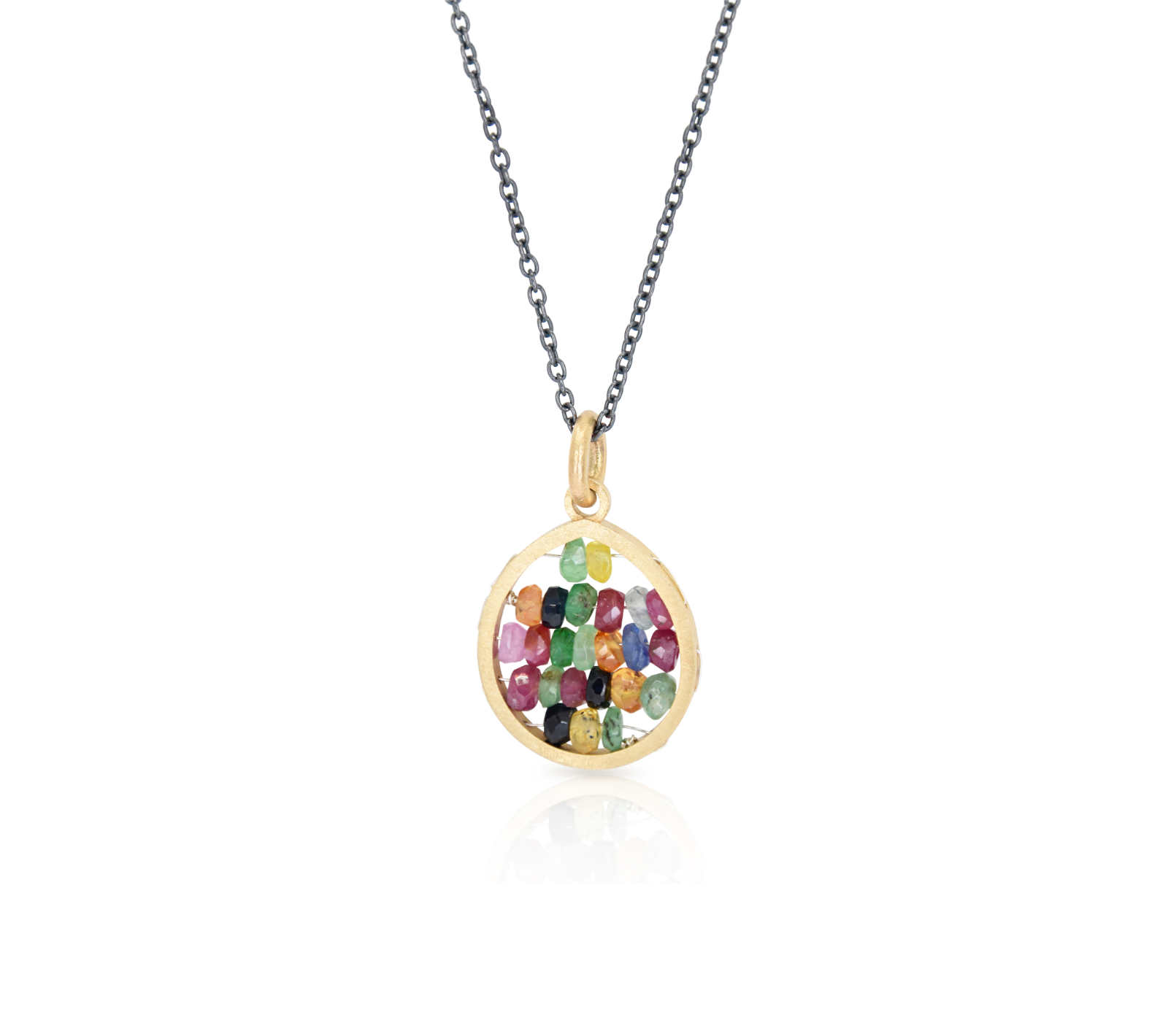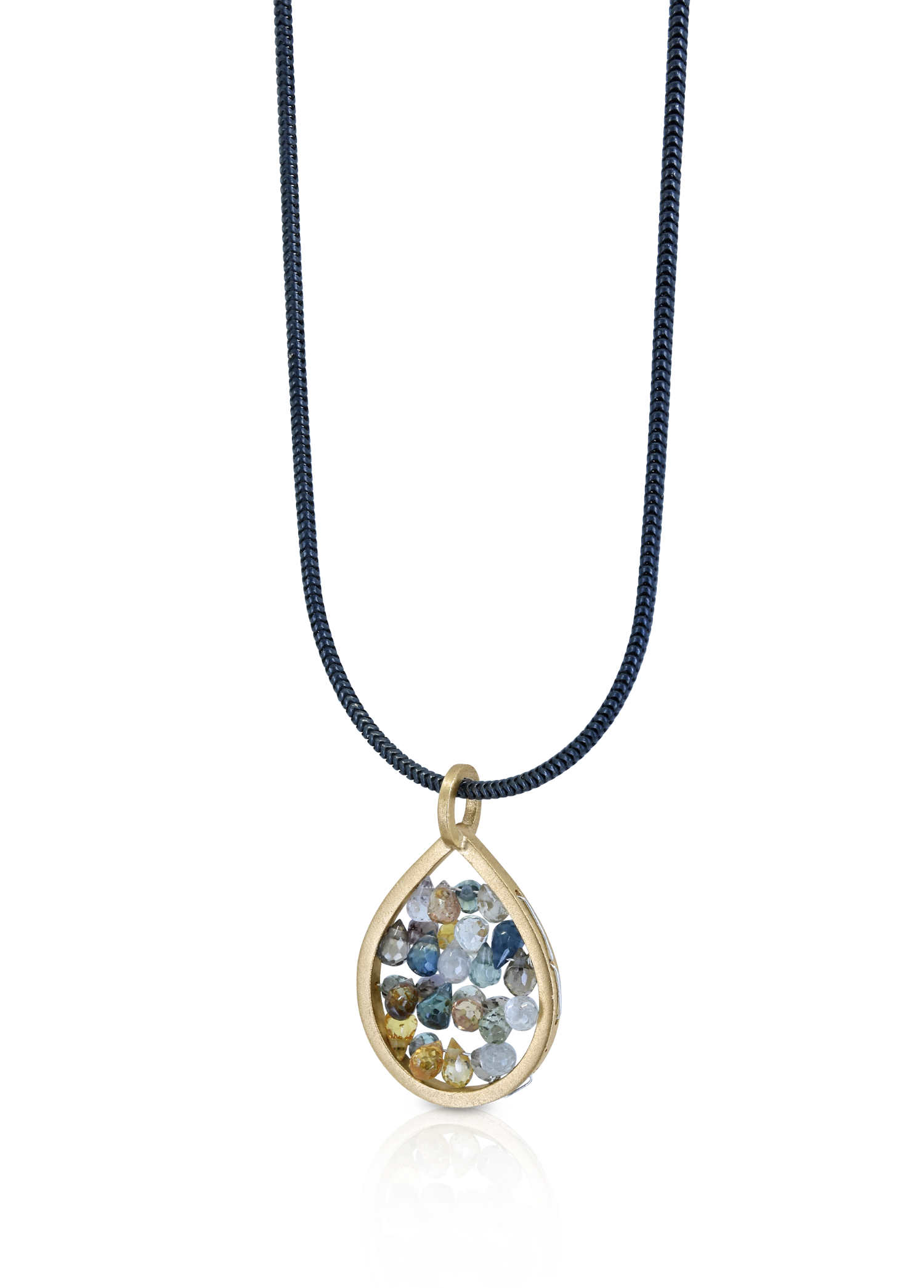 9ct yellow gold, mixed briolette sapphire beads, oxidised sterling silver neckpiece [23.5 x 15mm, 45cm chain] [$640]