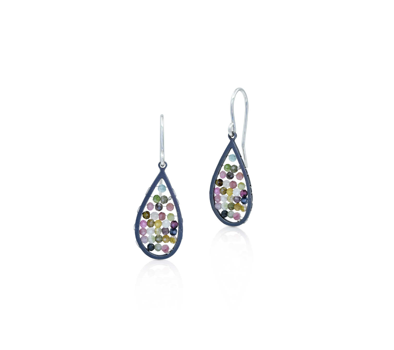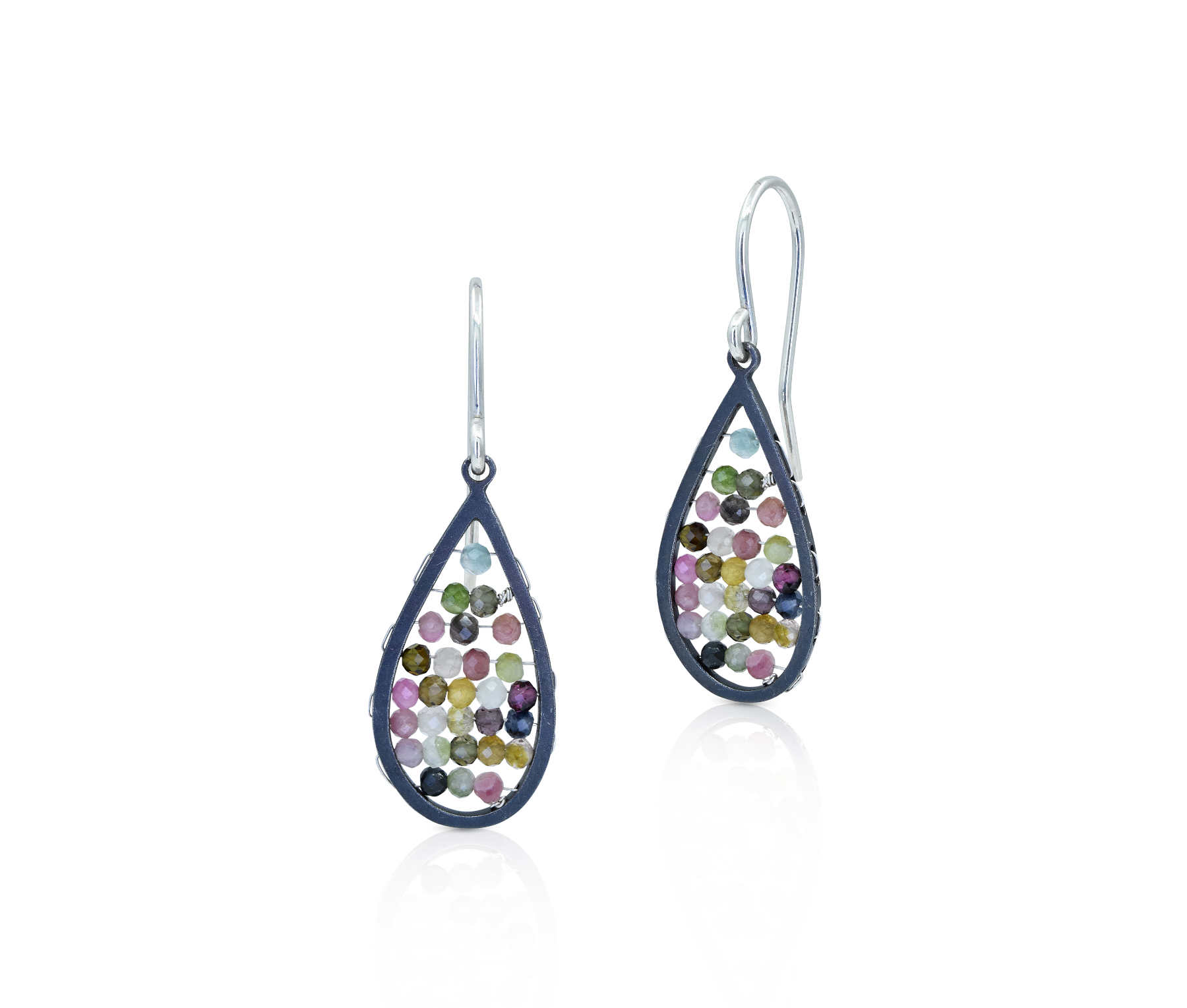 Oxidised sterling silver, mixed tourmaline bead hook earrings [37 x 12.25mm] [$510]