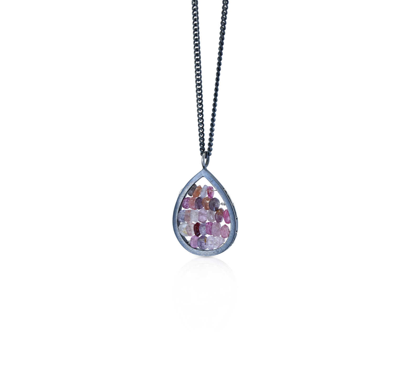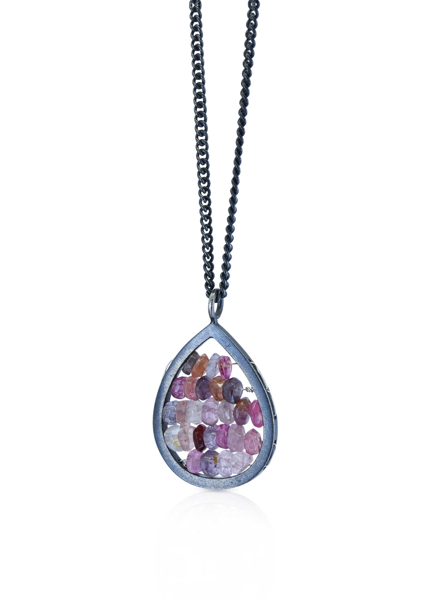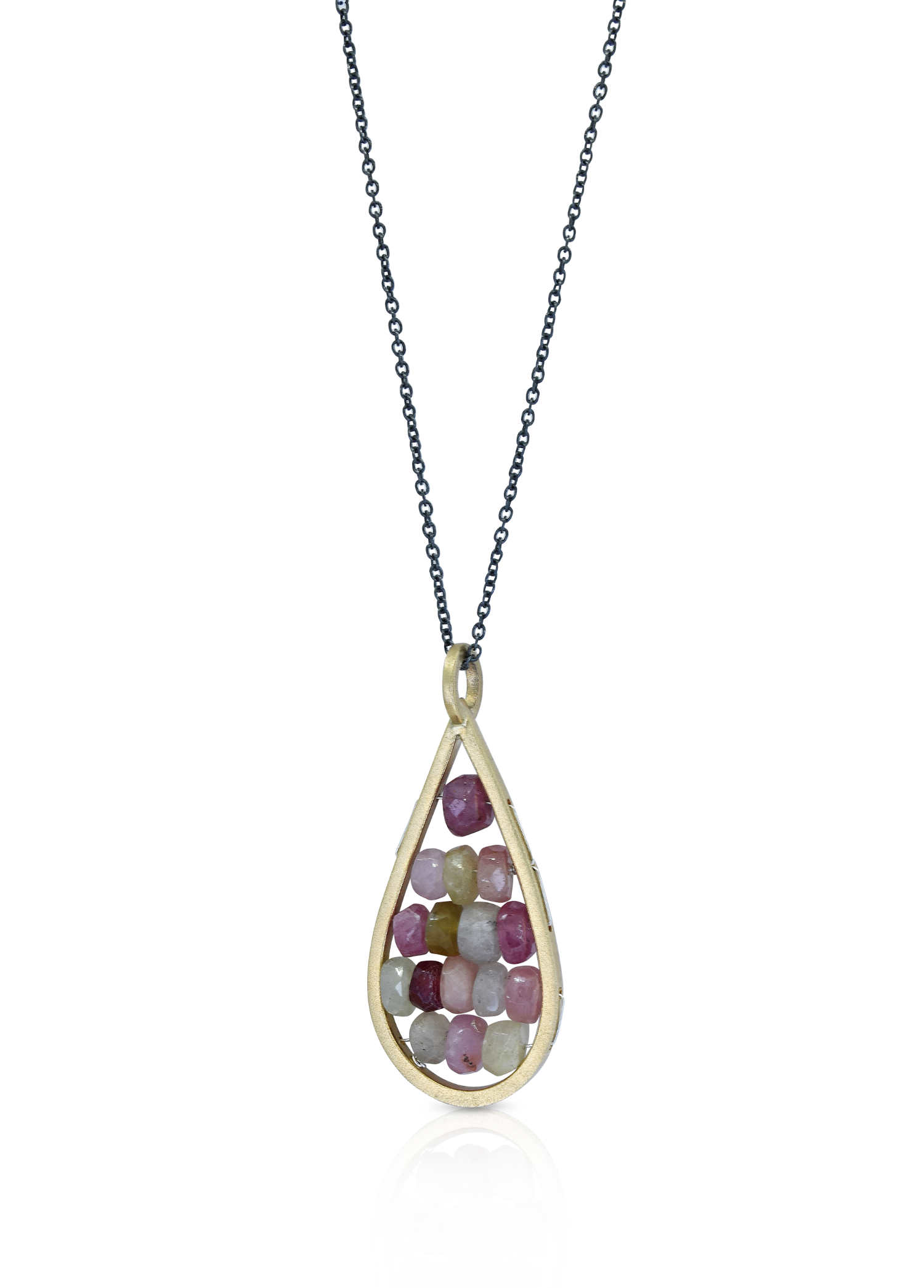 9ct yellow gold, mixed pink sapphire beads, oxidised sterling silver neckpiece [32.17 x 14.19mm, 45cm chain] [$565]