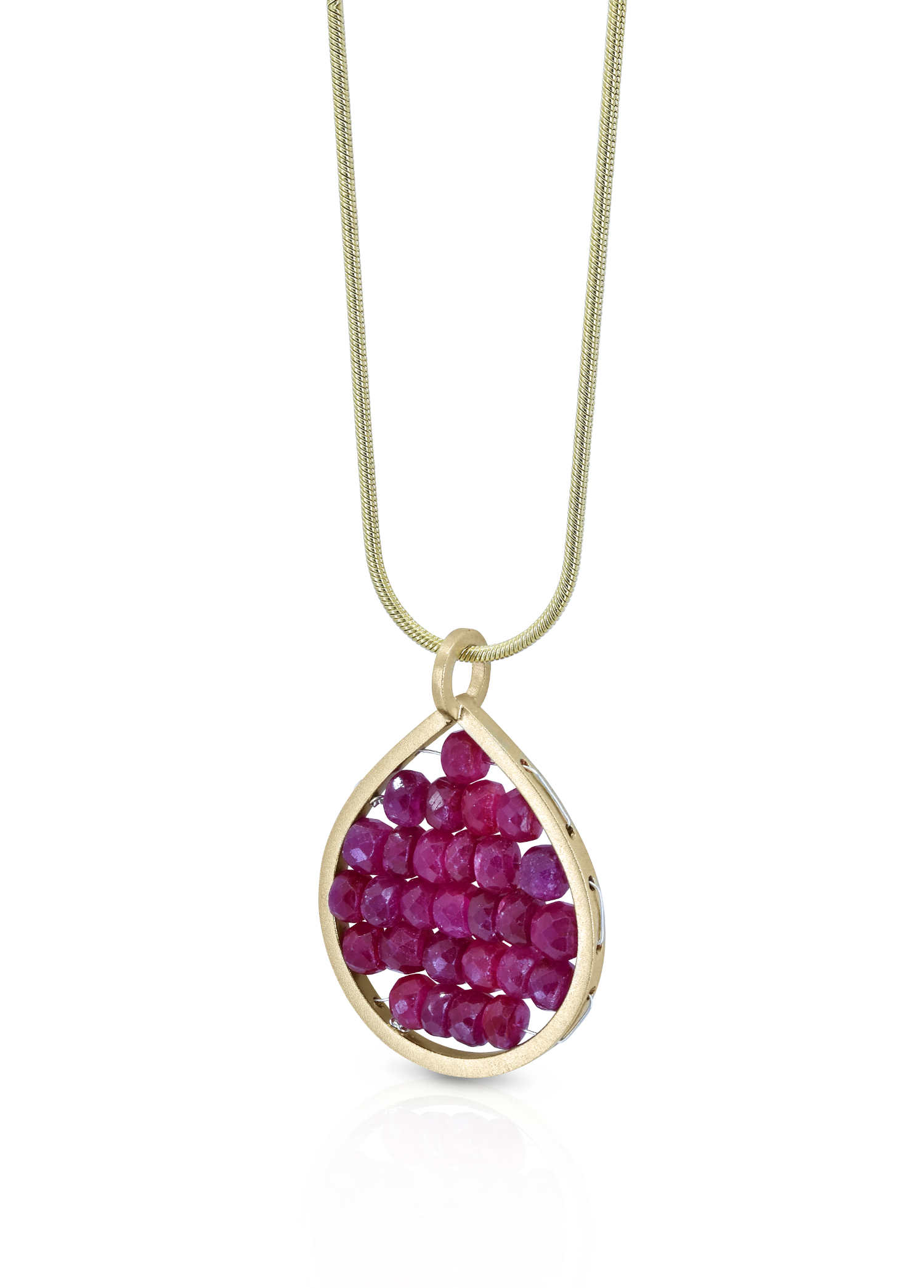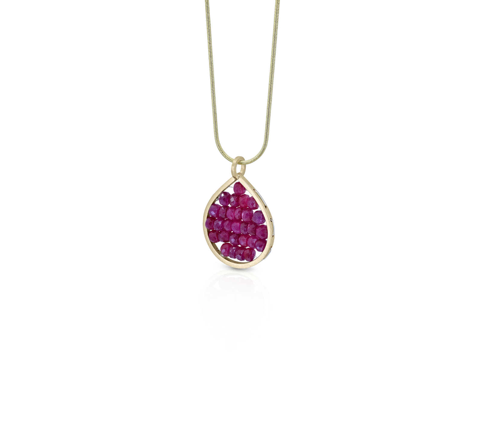 9ct yellow gold, faceted ruby bead, pear shaped pendant [40.21 x 20.13mm, 47cm chain] [$1,400]