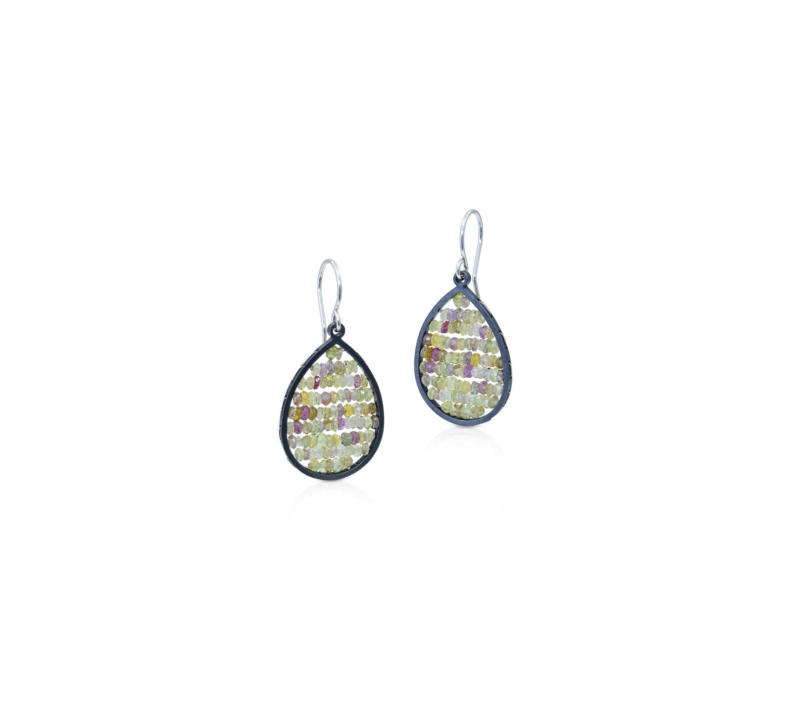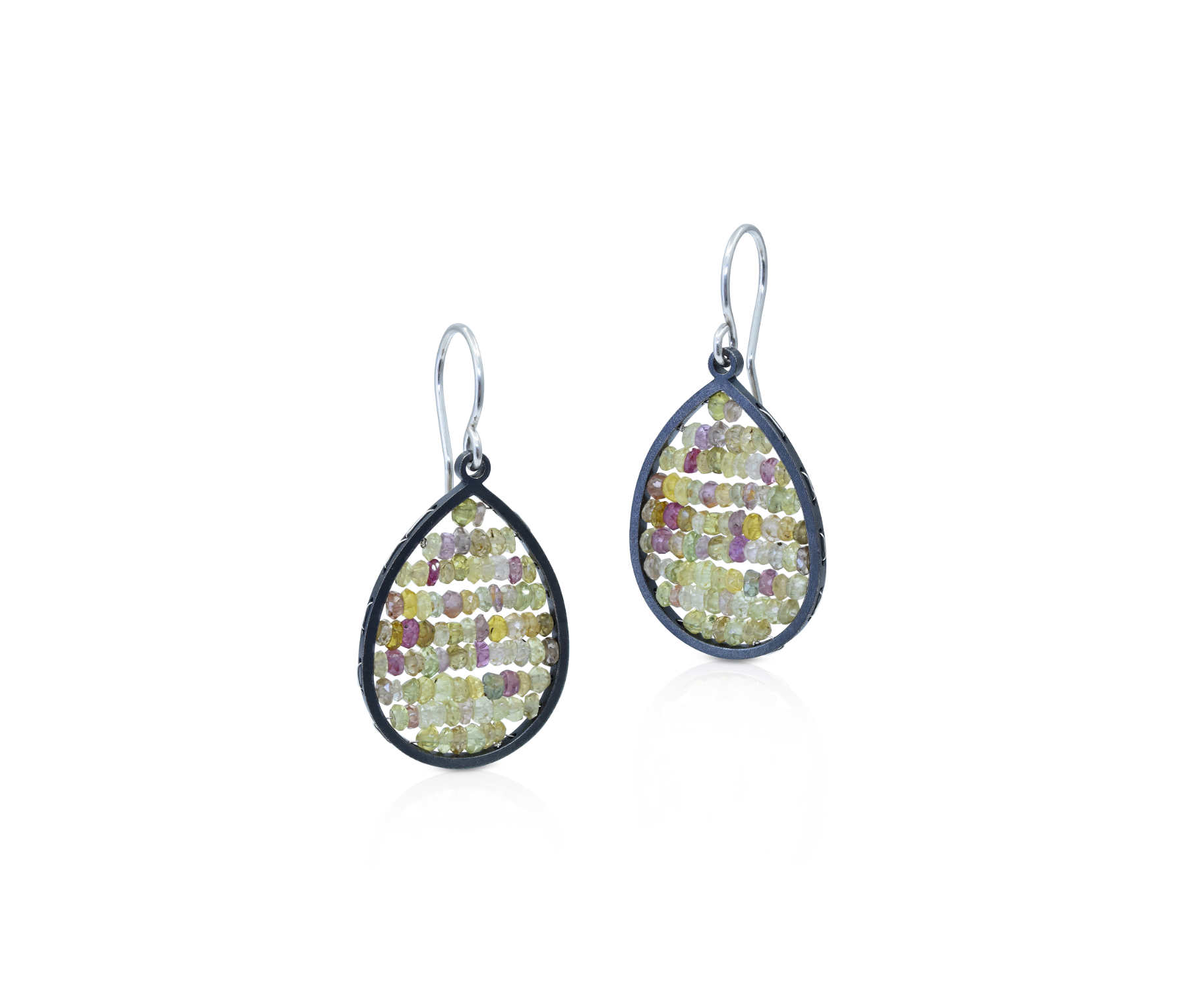 Oxidised sterling silver, pink and green mixed sapphire bead hook earrings [42.81 x 20.84mm] [$670]