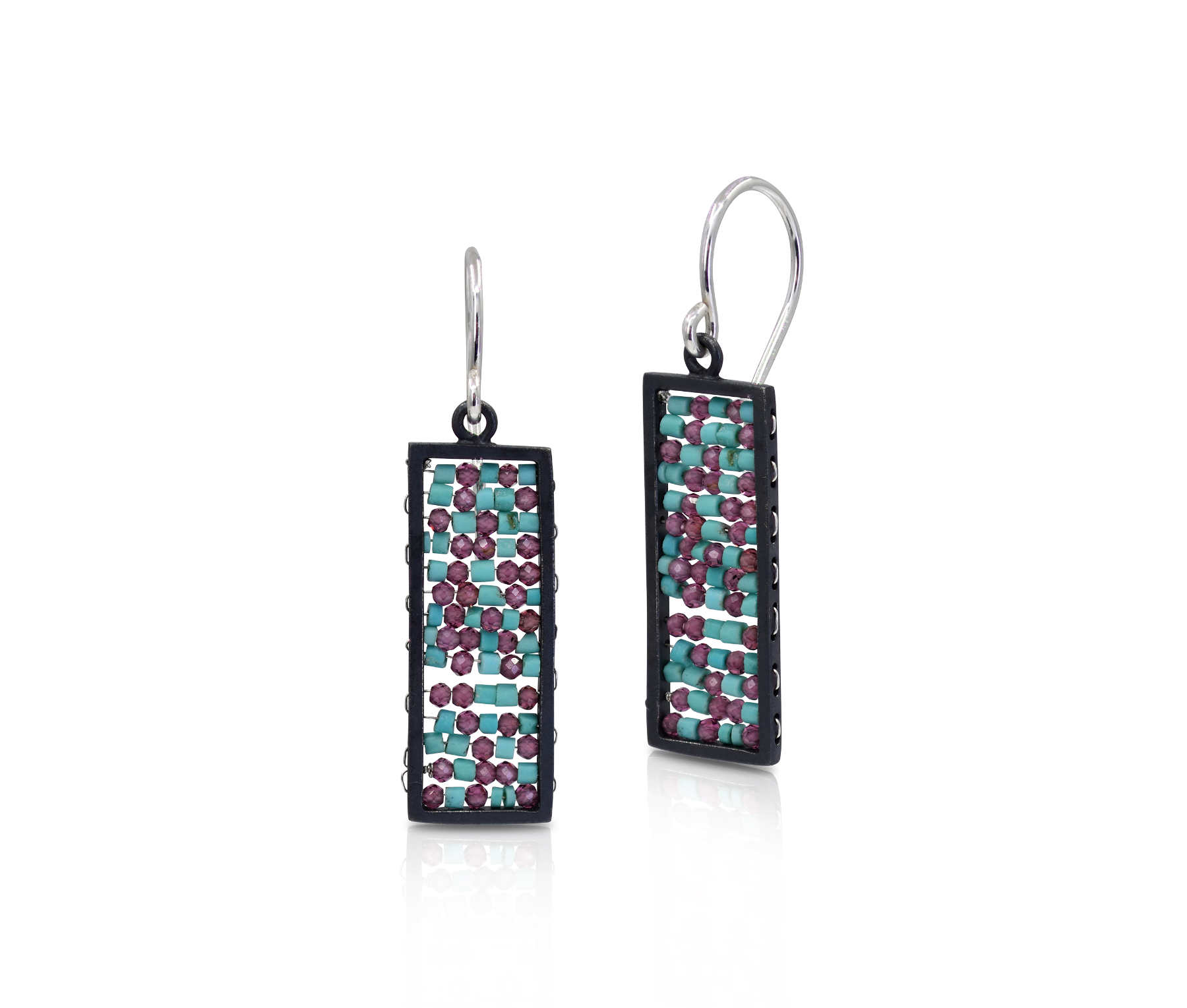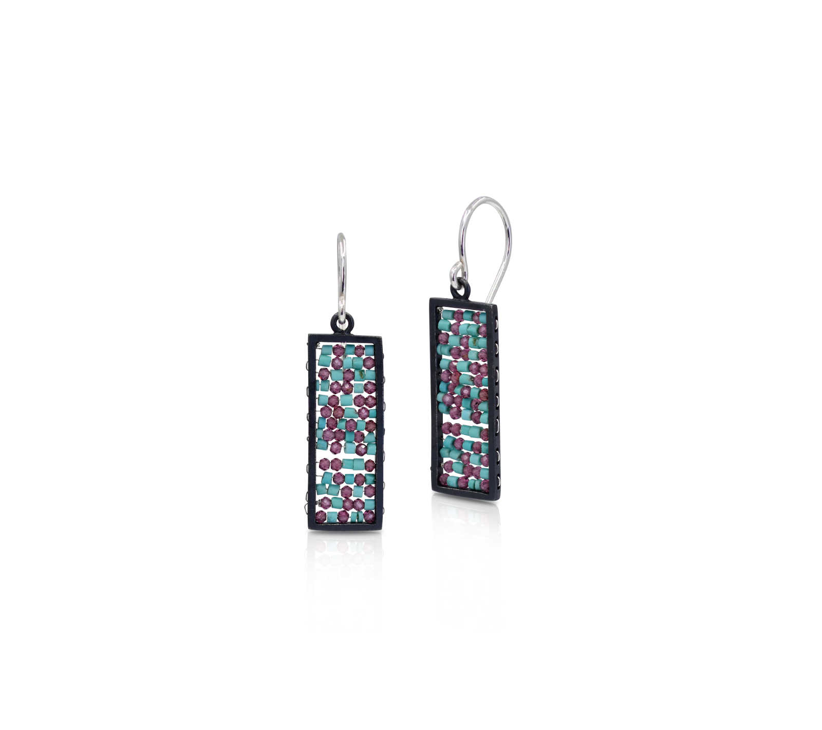 Sterling silver, turquoise, ruby beads, portrait rectangle hook earrings [40 x 9.95mm] [$560]
