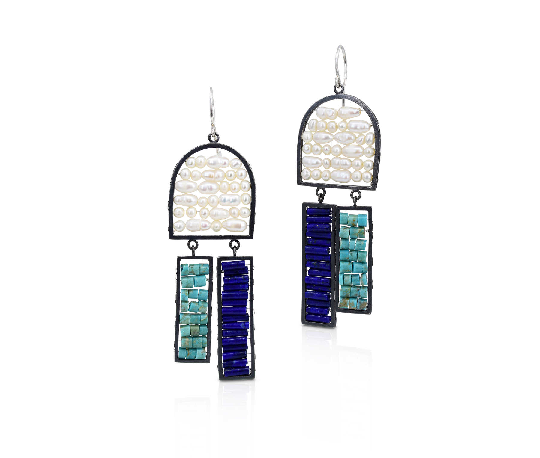 Oxidised sterling silver, pearl, turquoise, lapis lazuli bead, arch rectangle hook earrings [80.26 x 29.23mm] [$1,100]