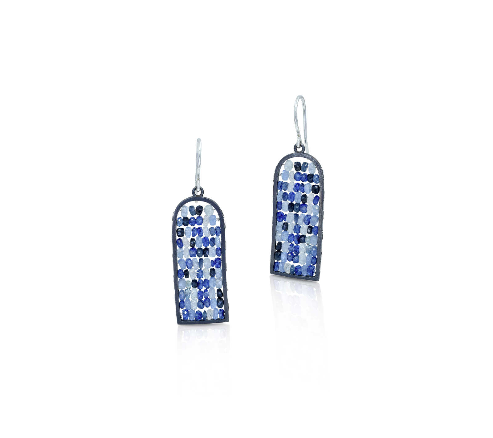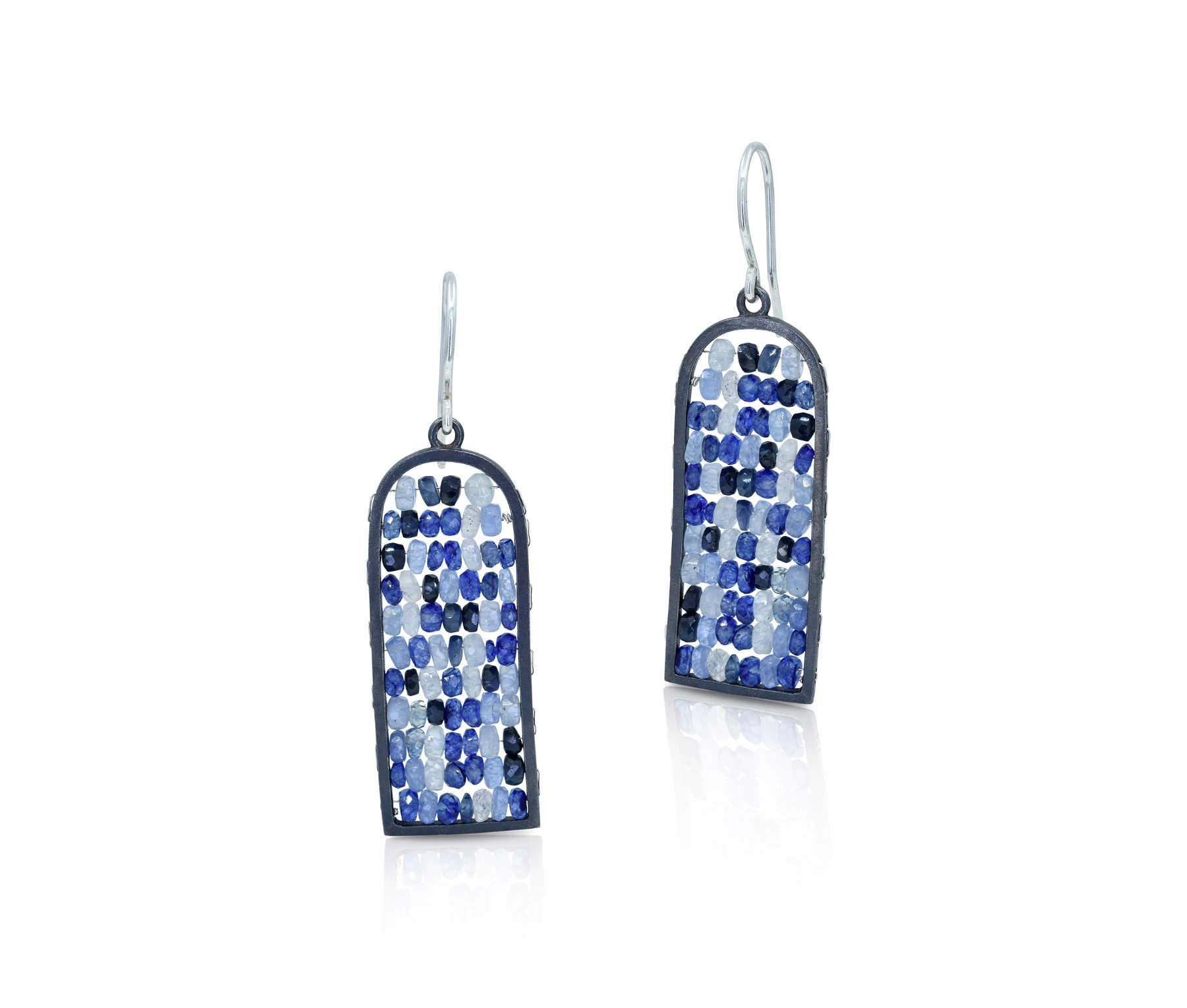Oxidised sterling silver, mixed sapphire bead hook earrings [52.14 x 15.62mm] [$805]