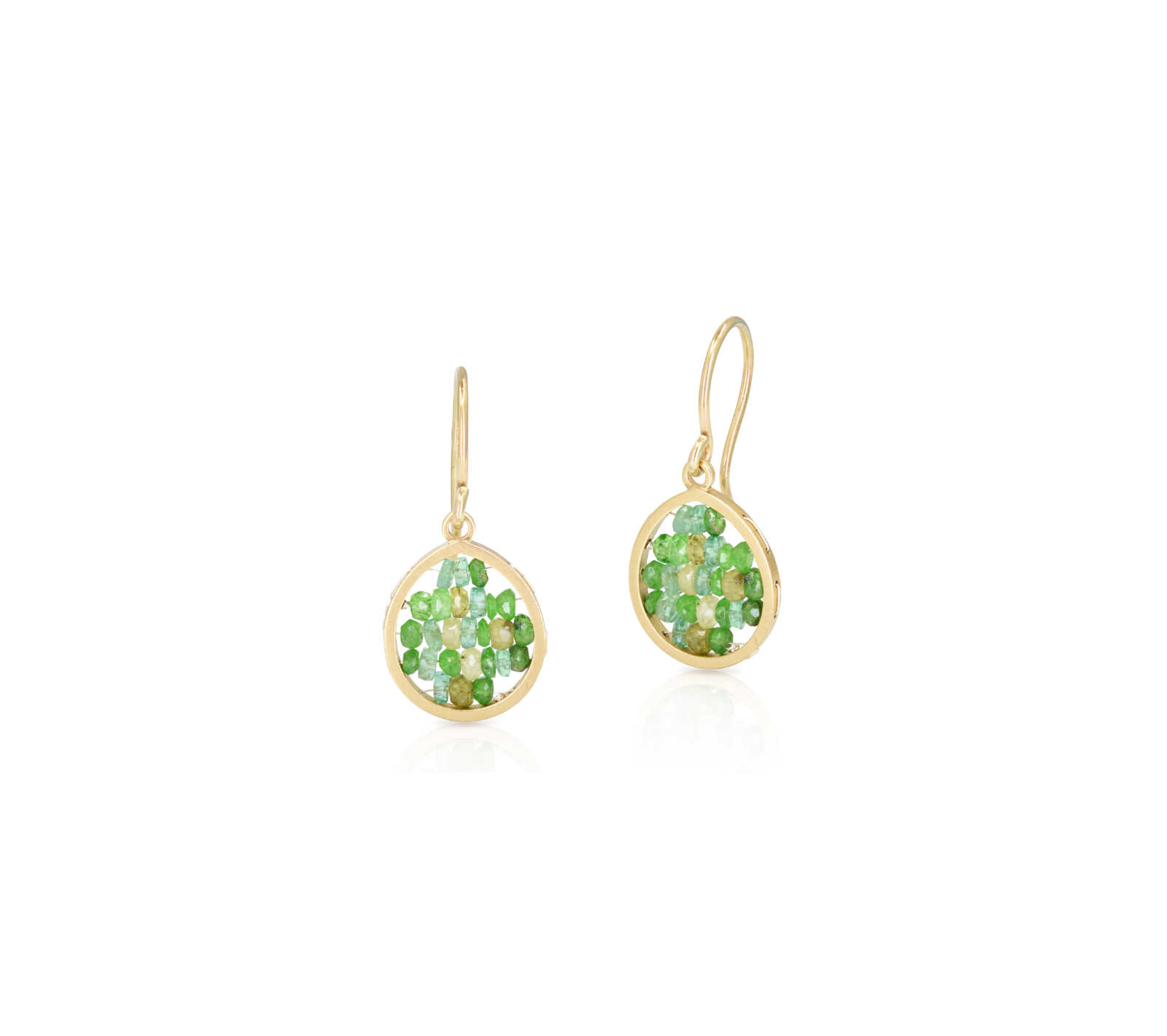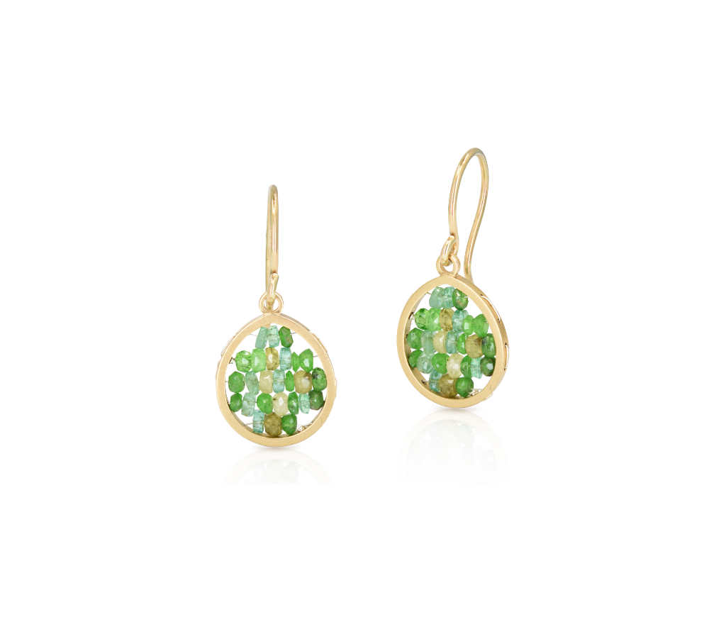 9ct yellow gold, 2.3ct tsavorite garnet, 1.6ct grossular garnet, 1.8ct emerald beads [30 x 15mm] [$1,005]