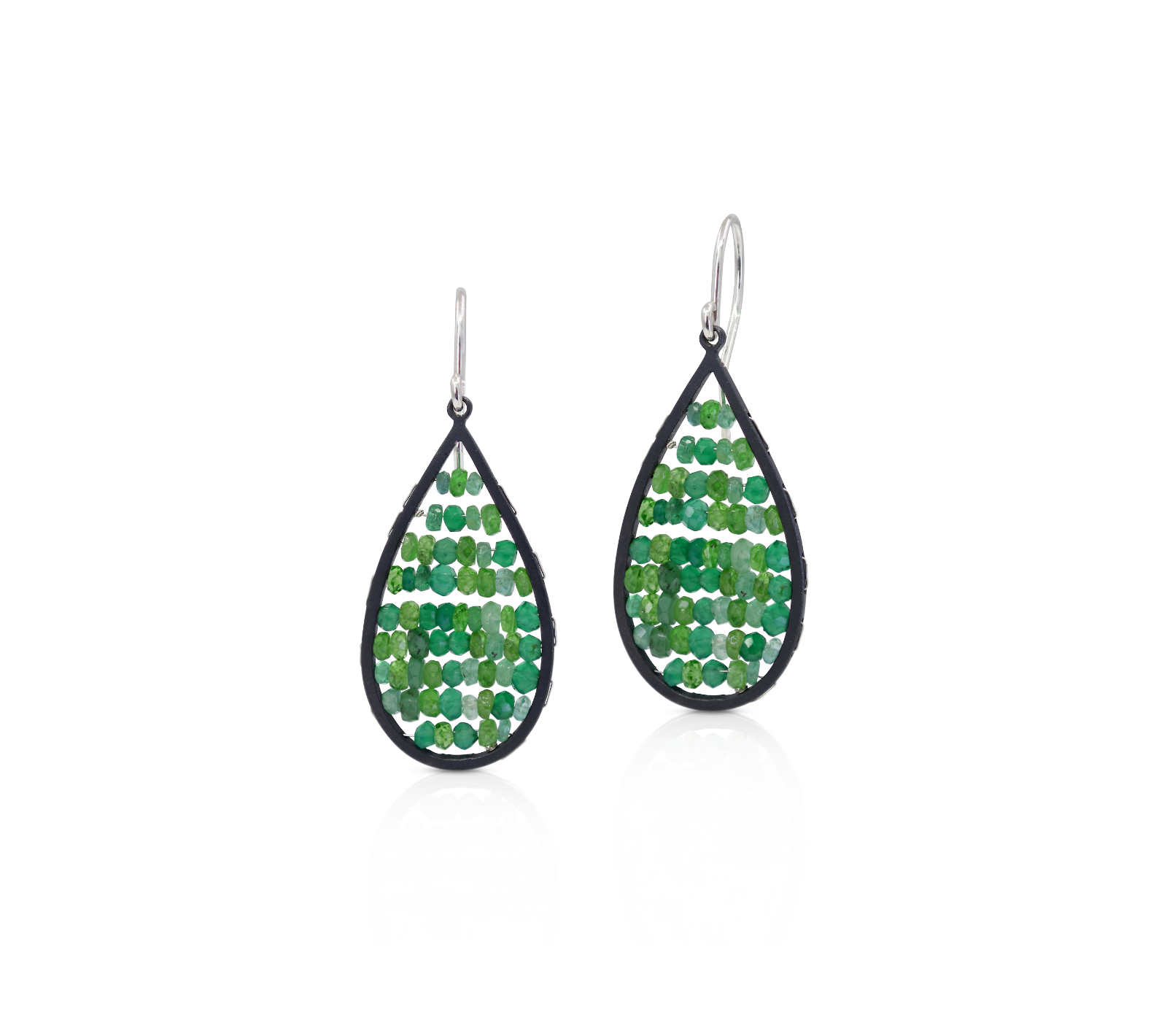 Oxidised sterling silver, emerald, tsavorite garnet, green onyx faceted beads, pear shaped earrings [33 x 18mm] [$805]