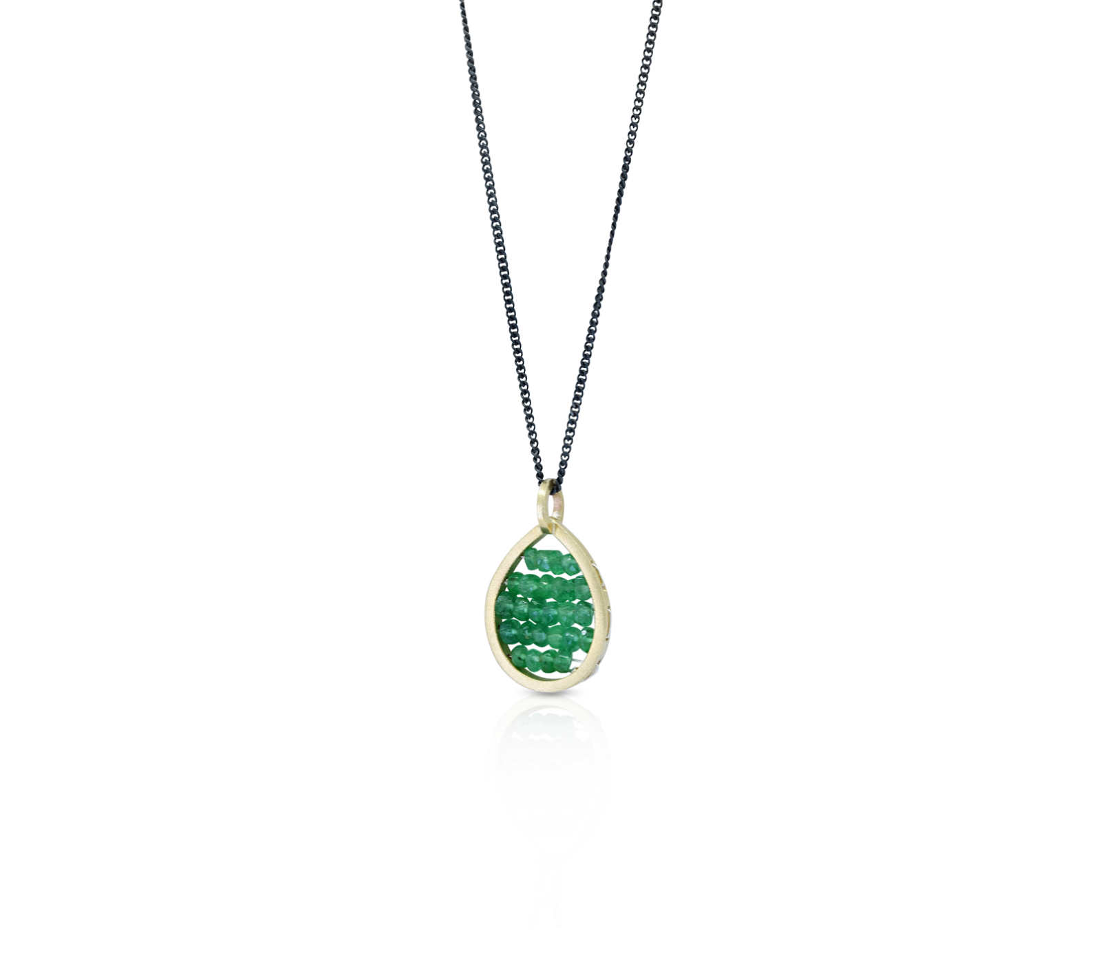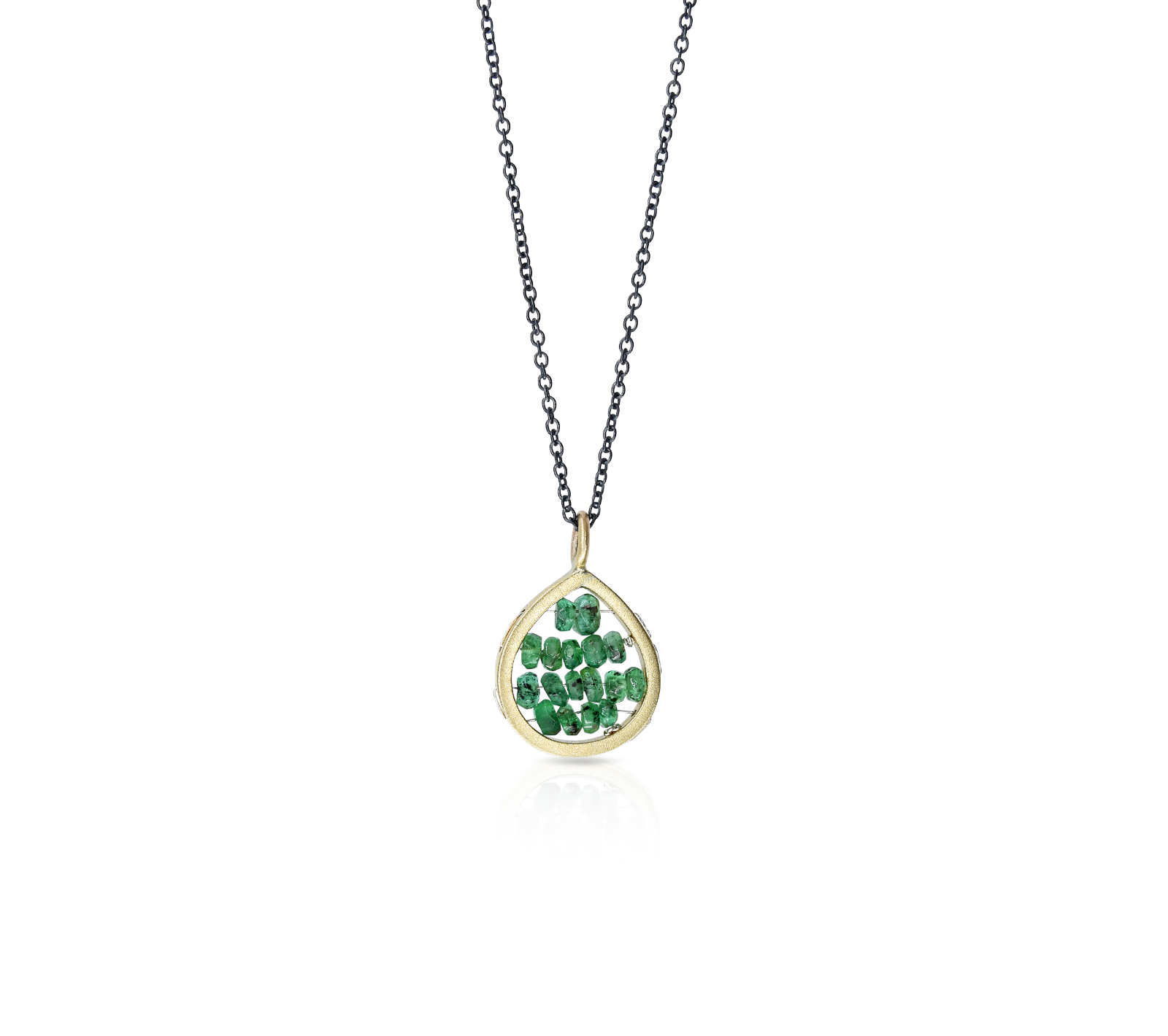 9ct yellow gold, oxidised silver, faceted emerald beads, pear shaped pendant [16.85 x 11.70mm, 40cm chain] [$370]
