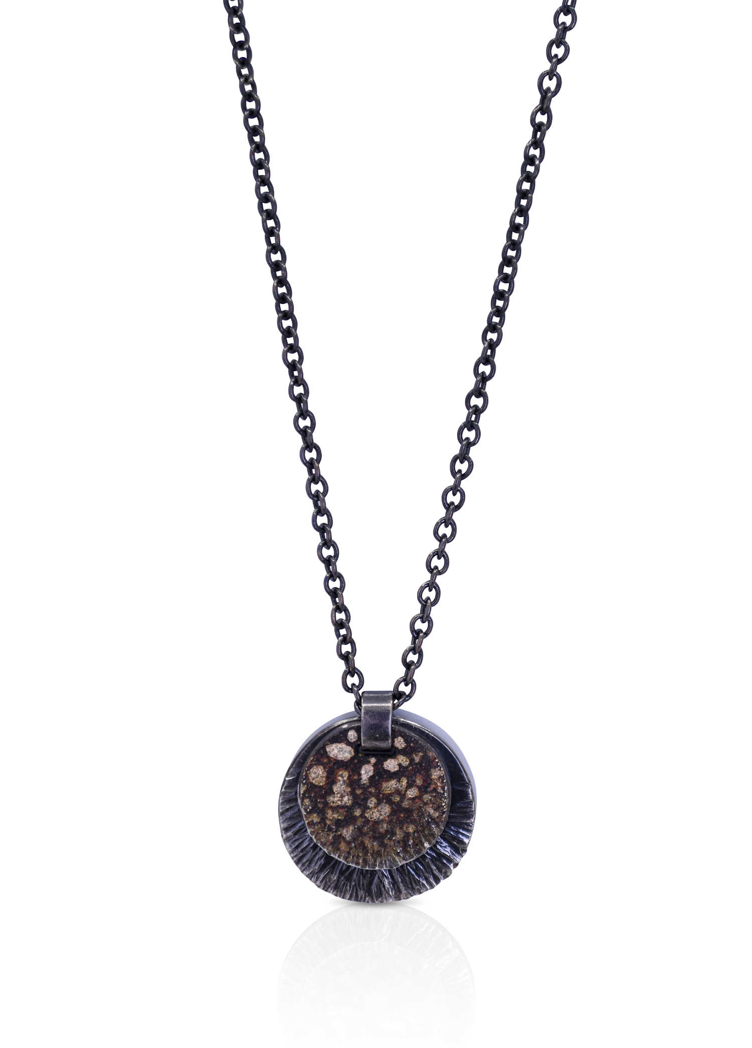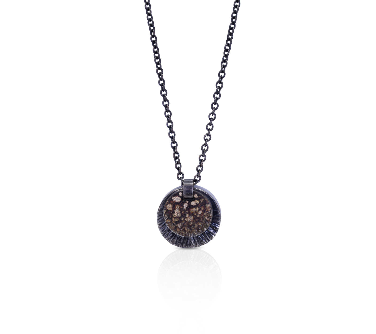 Oxidised sterling silver, 18ct yellow gold frosting and boulders pendant [30 x 32mm, Chain 45cm] [$POA]