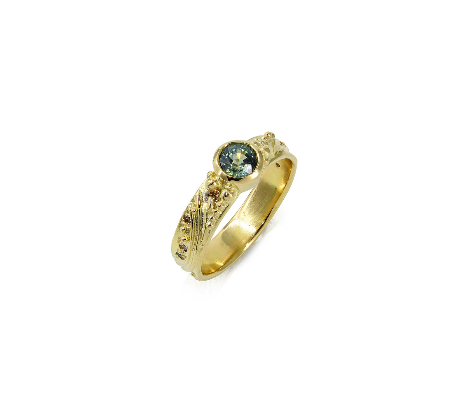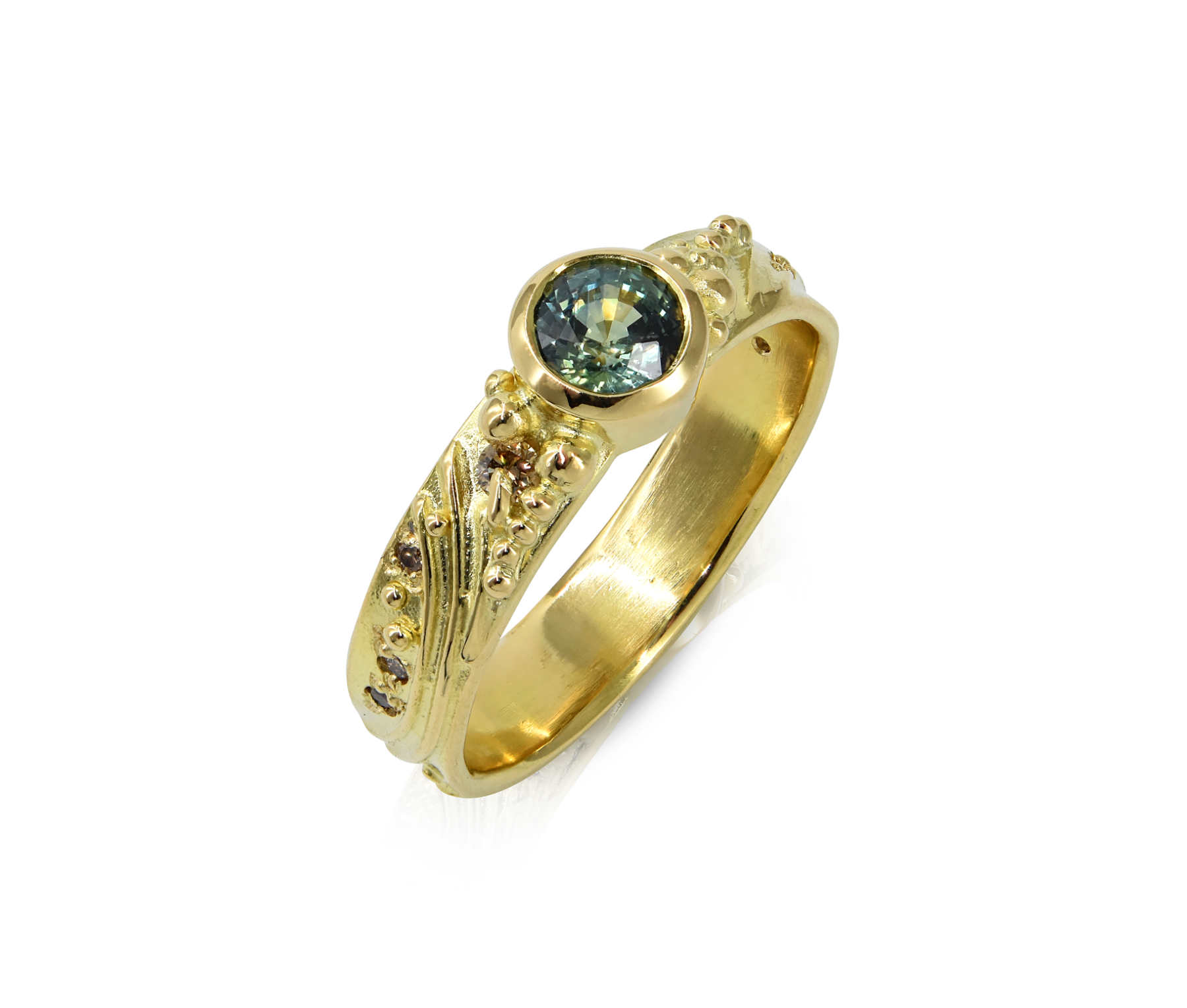 18ct yellow gold, mid blue sapphire, cognac diamonds [4.7mm] [$6,500]