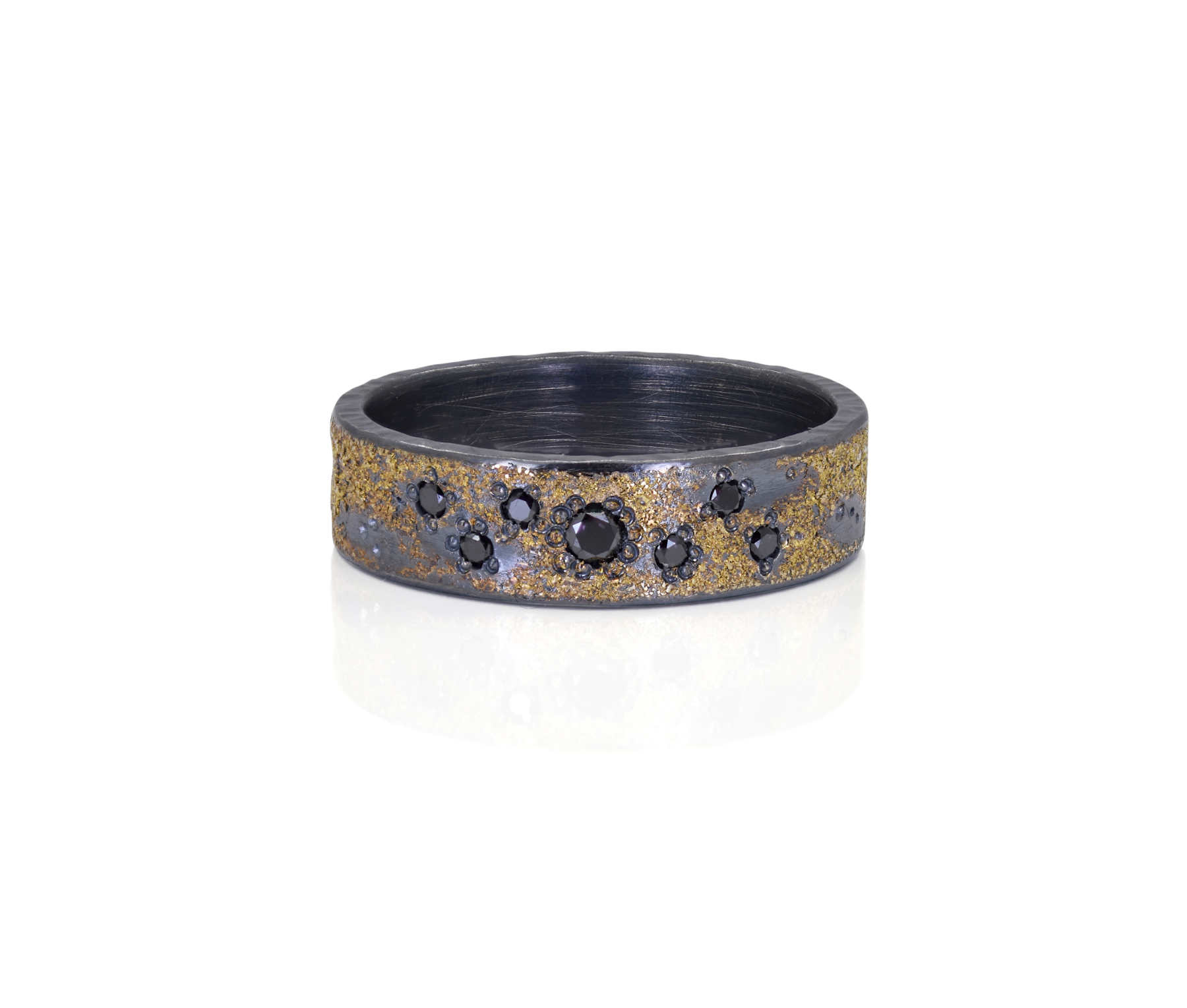 Oxidised sterling silver, 18ct yellow gold frosting, black diamond ring [6mm] [$1,300]