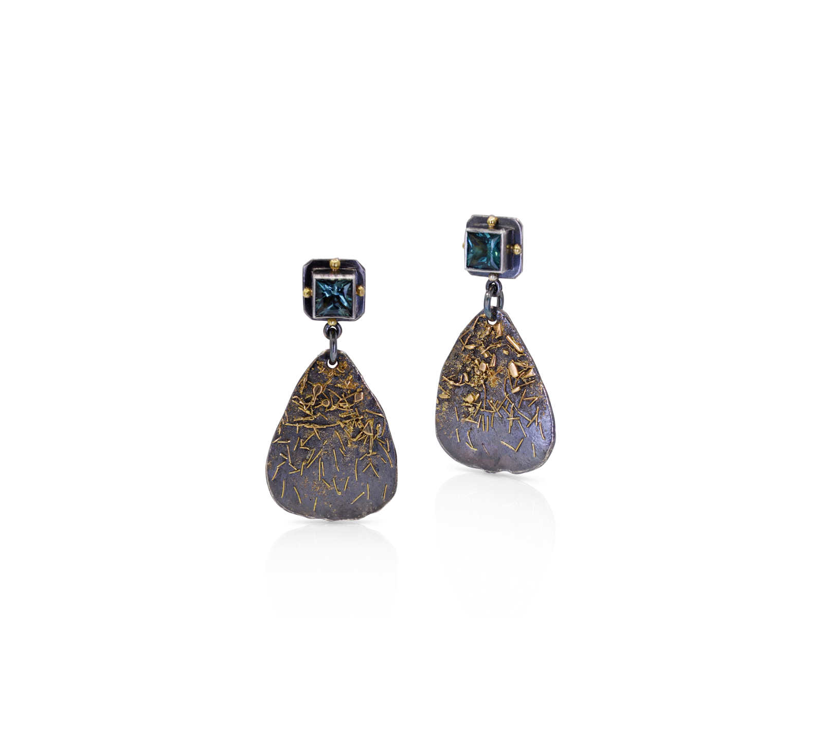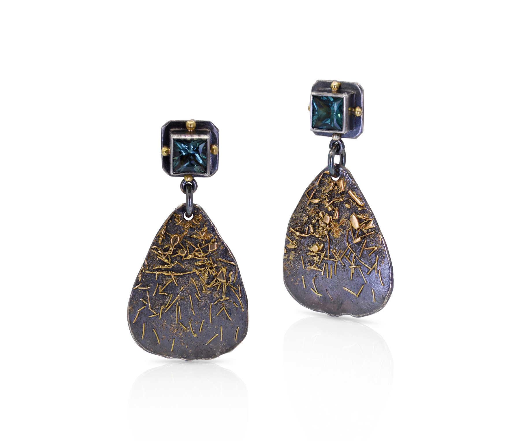 Oxidsed sterling silver, 18ct yellow gold, princess cut blue green tourmaline stud earrings [35 x 20mm] [$2,365]
