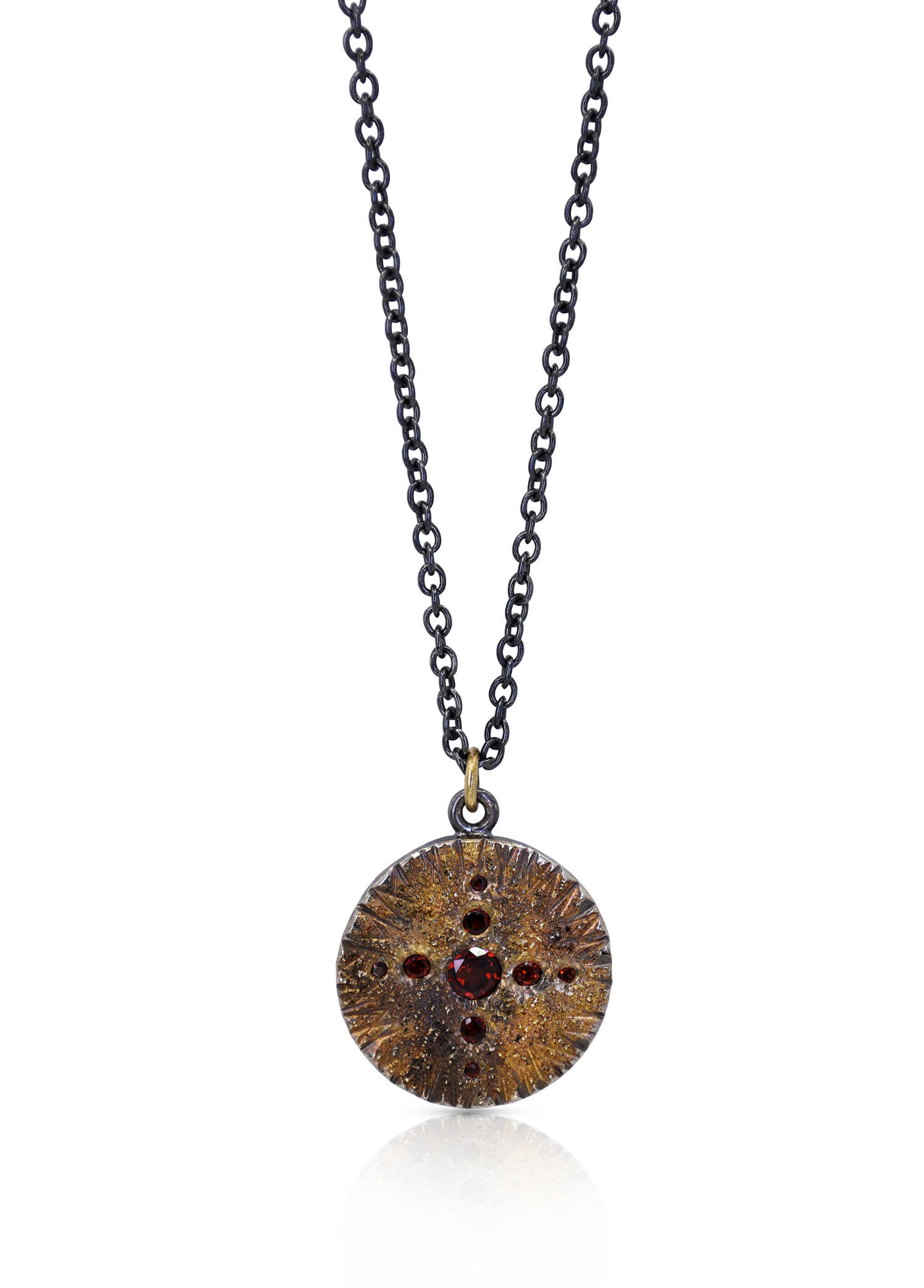 Oxidised sterling silver, 18ct yellow, rose, white gold frosting, garnet [20 x 25.8mm, Chain 44cm] [$POA]