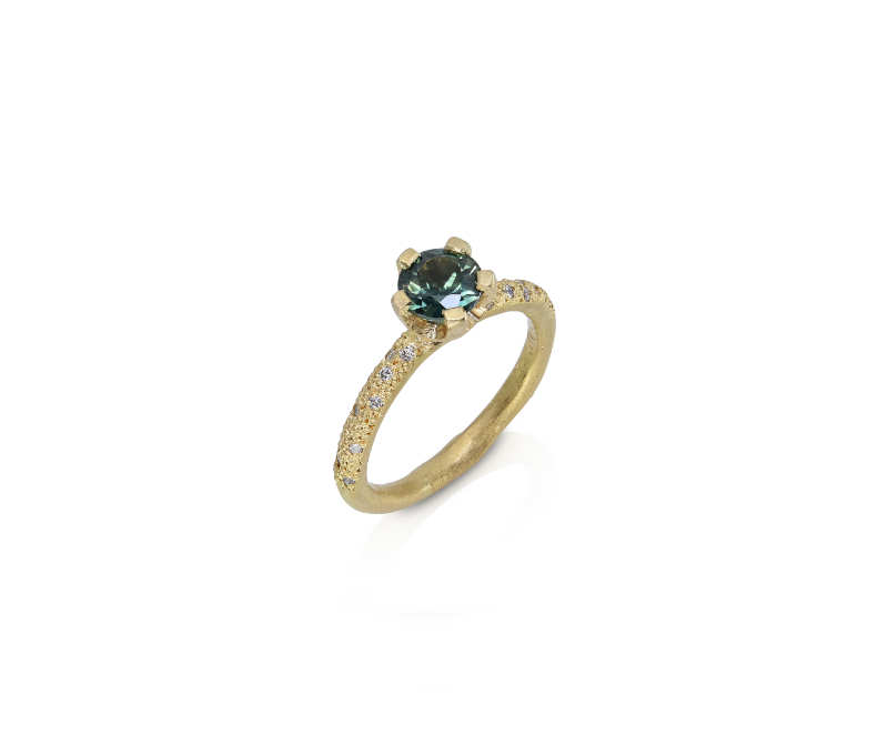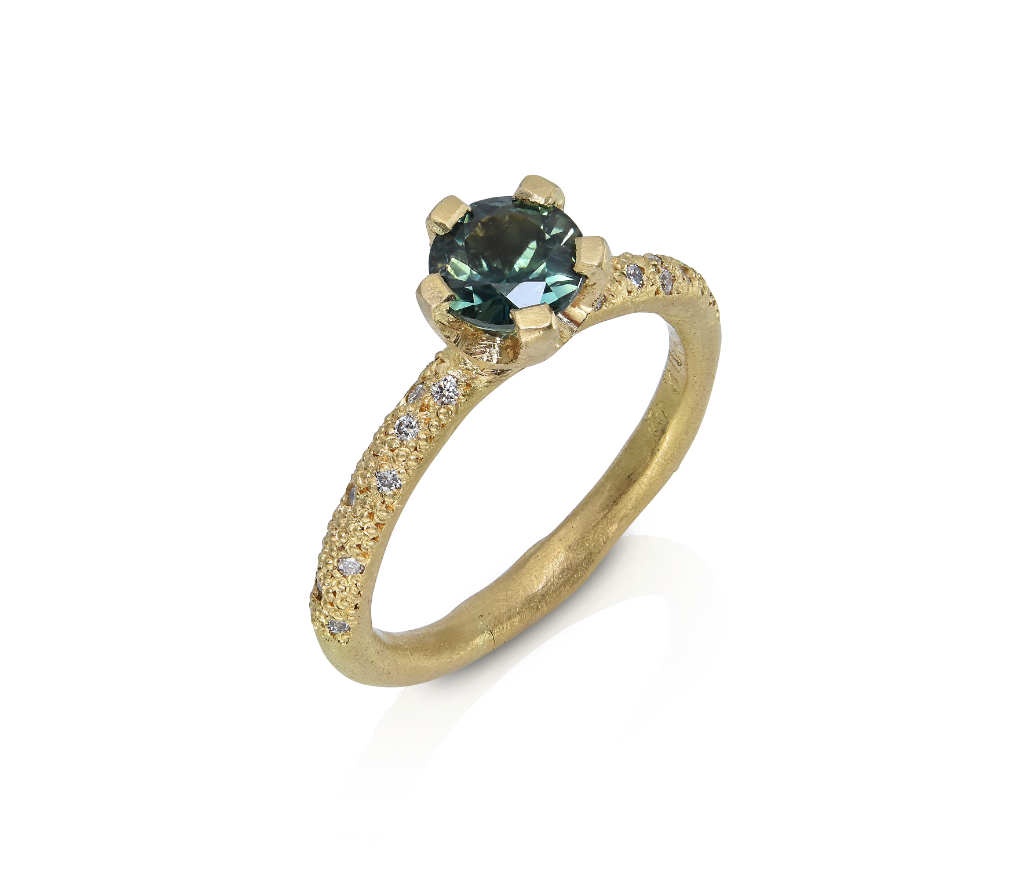18ct yellow gold, teal green sapphire, white diamond ring [7.35mm at setting, 2.65mm band] [$4,020]