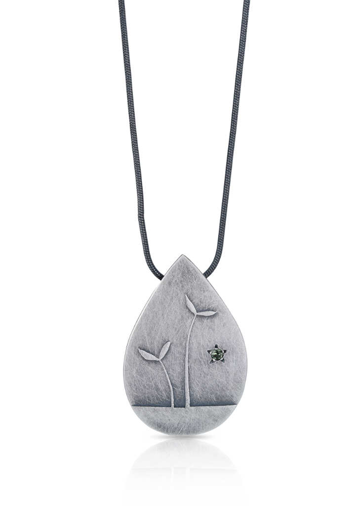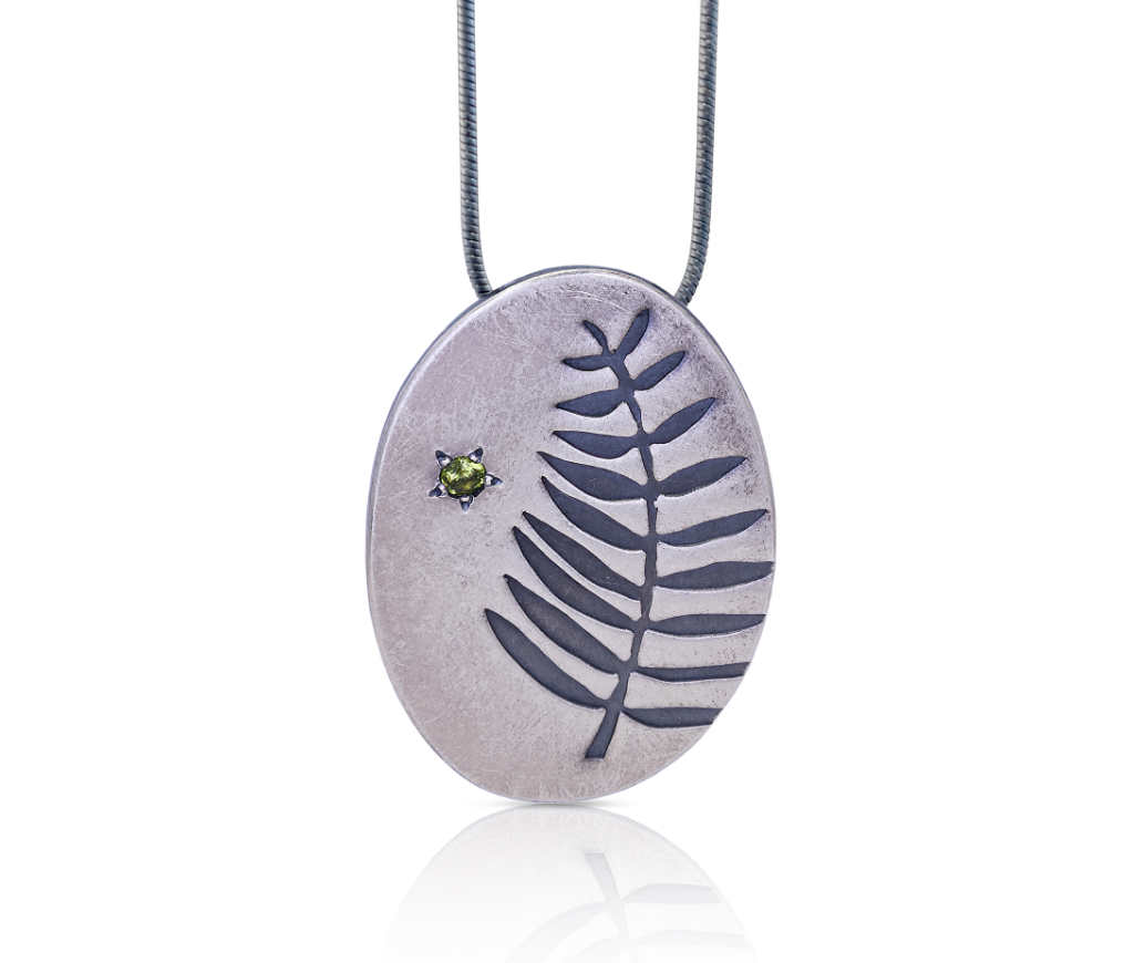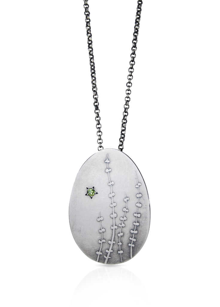 Oxidised sterling silver, green sapphire pendant [34.5 x 50mm, Chain 70cm] [$465]