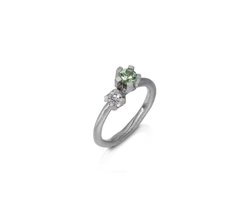 18ct white gold, green sapphire, champagne diamond ring [7.5mm at setting, 2.45mm band] [$3,710]